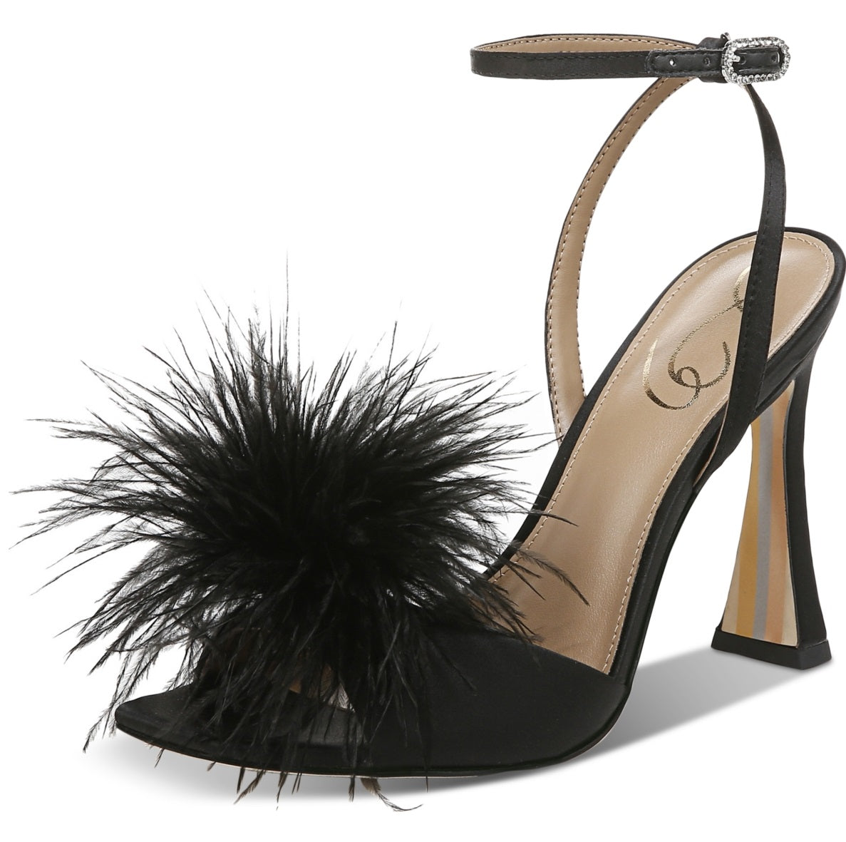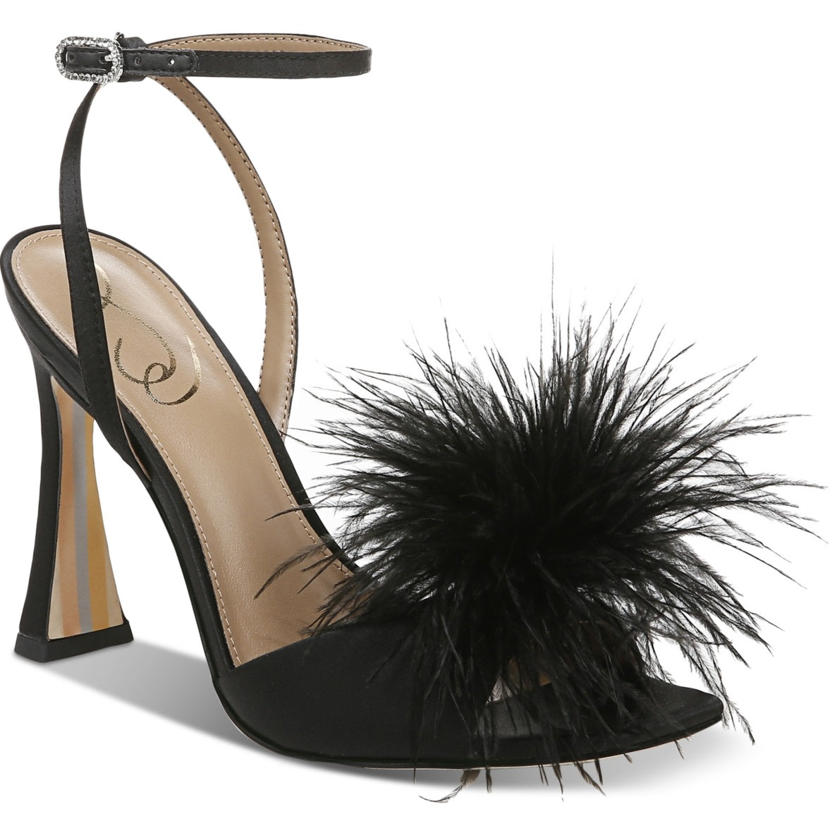 A fluffy burst of feathers bring pom pom appeal to slender straps and flared heels in the Leon sandals from Sam Edelman.| 4 flare heel| Round-toe ankle-strap dress sandals with adjustable buckle closure| Feather pom pom detail at strap| Fabric upper; manmade lining; manmade sole| Imported