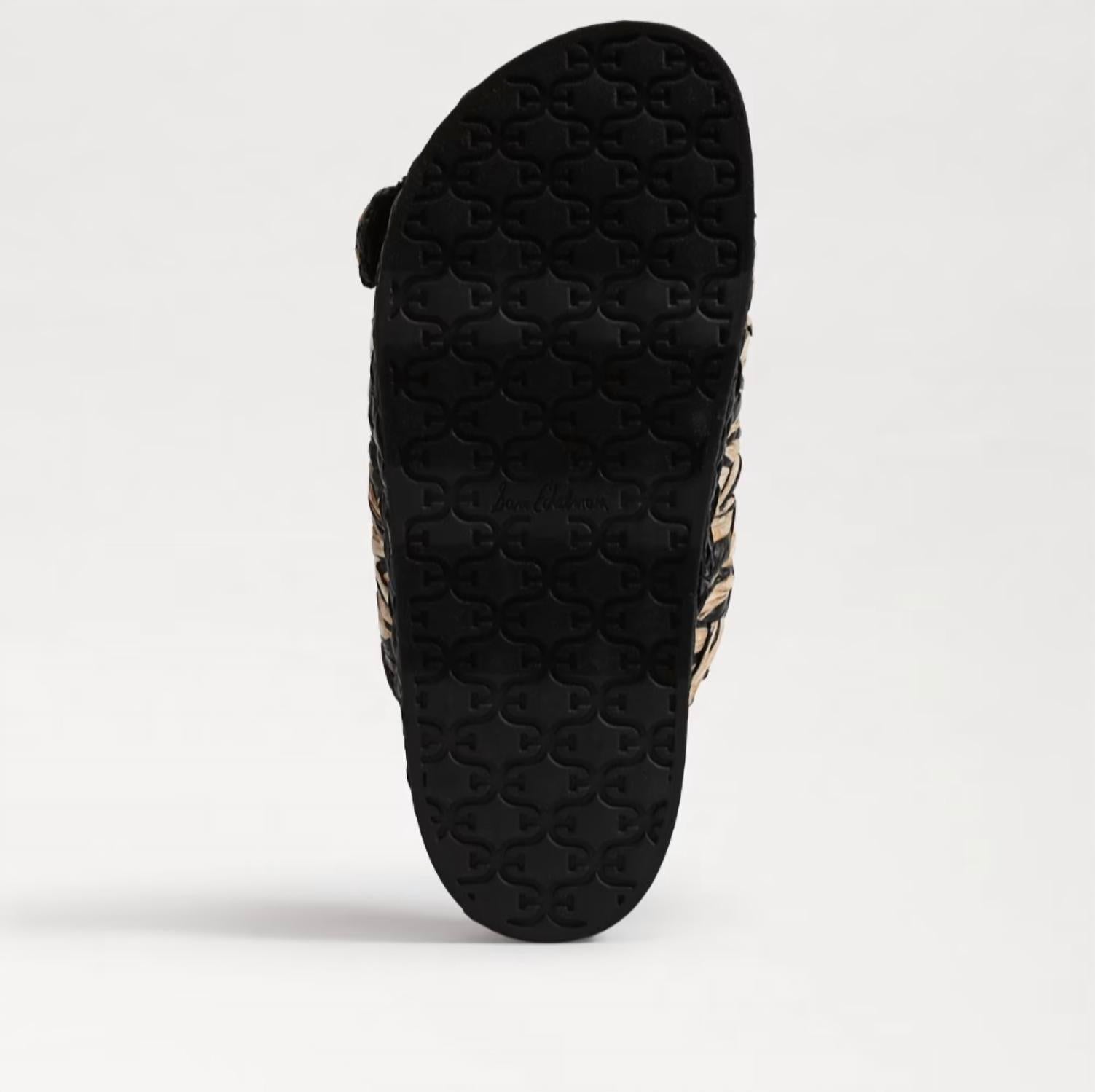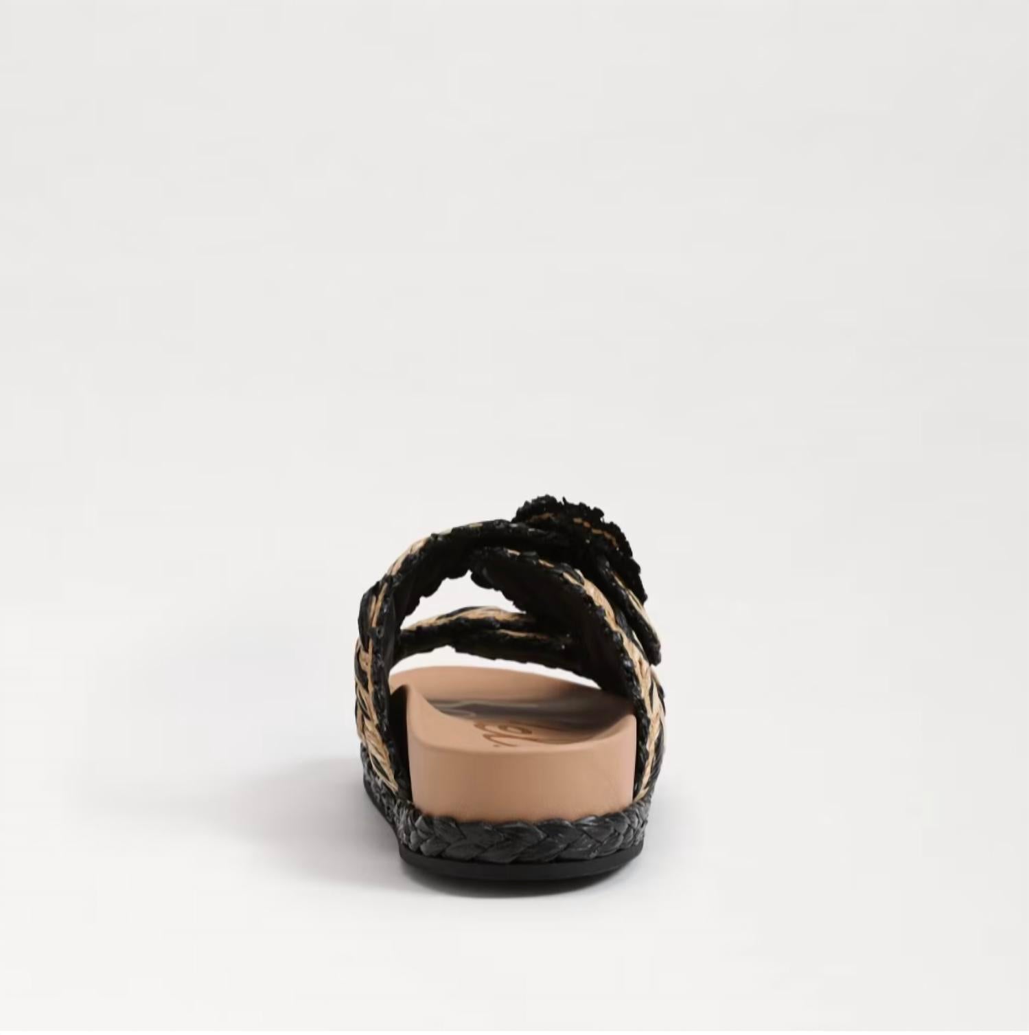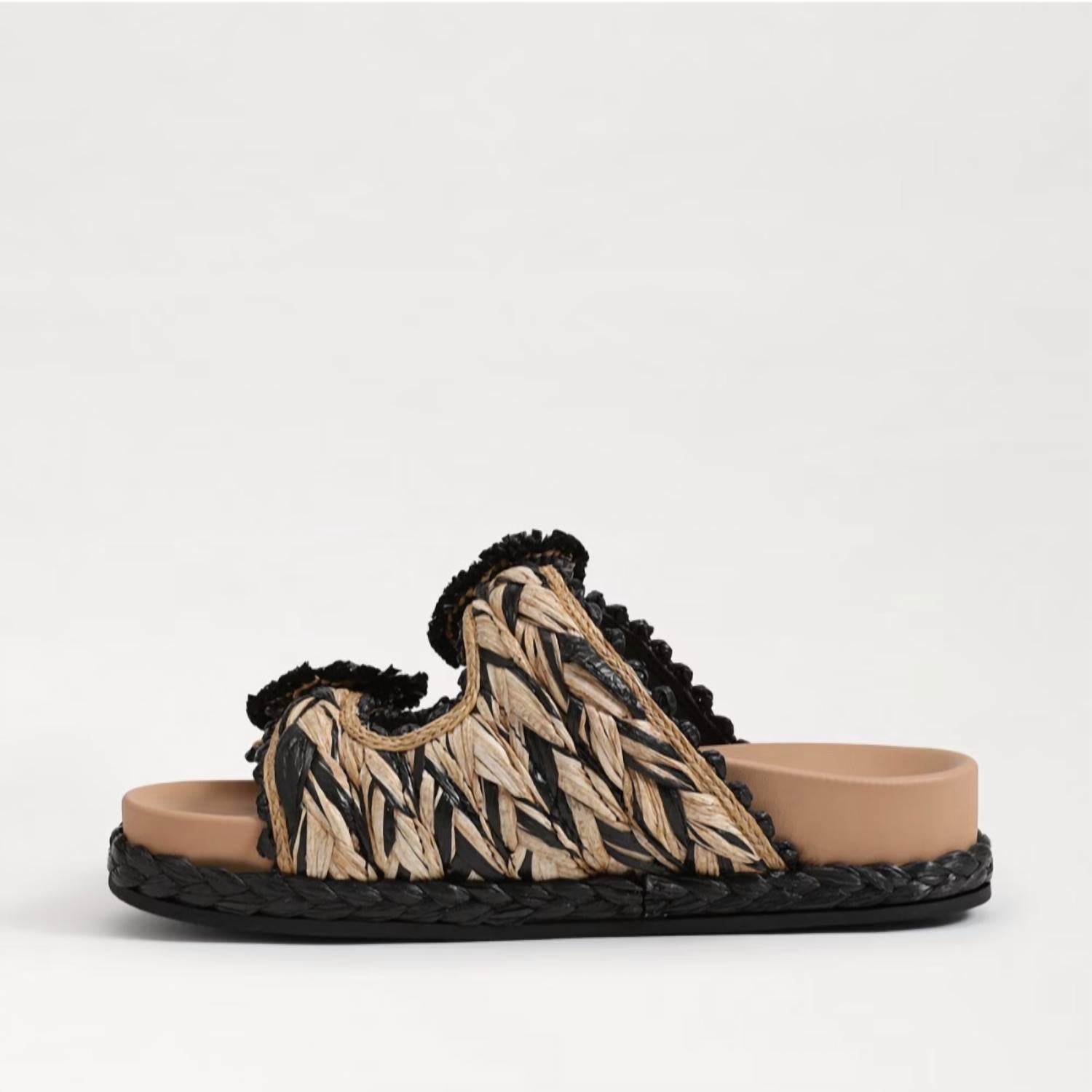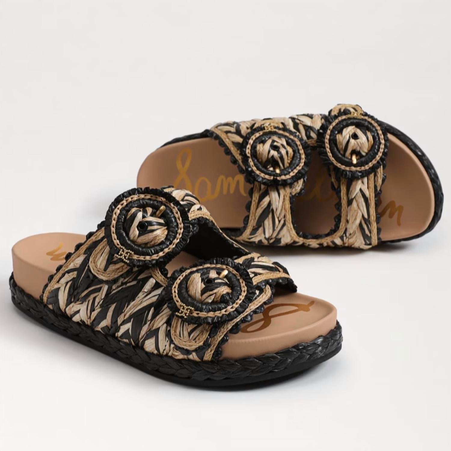 Classicly cute and all-day-wearable. We love this sandal. The Women's Reina Rounded Open Toe Slip On Espadrilles Flat Sandals by Sam Edelman combine boho charm with chic embellishments in a Black Natural Raffia finish. These sandals feature an open toe design with a 1.3-inch platform and a slip-on closure for easy wear. Crafted with a fabric material and synthetic insole, they offer comfort and style wherever you go. Perfect for fall travel or Thanksgiving gatherings.