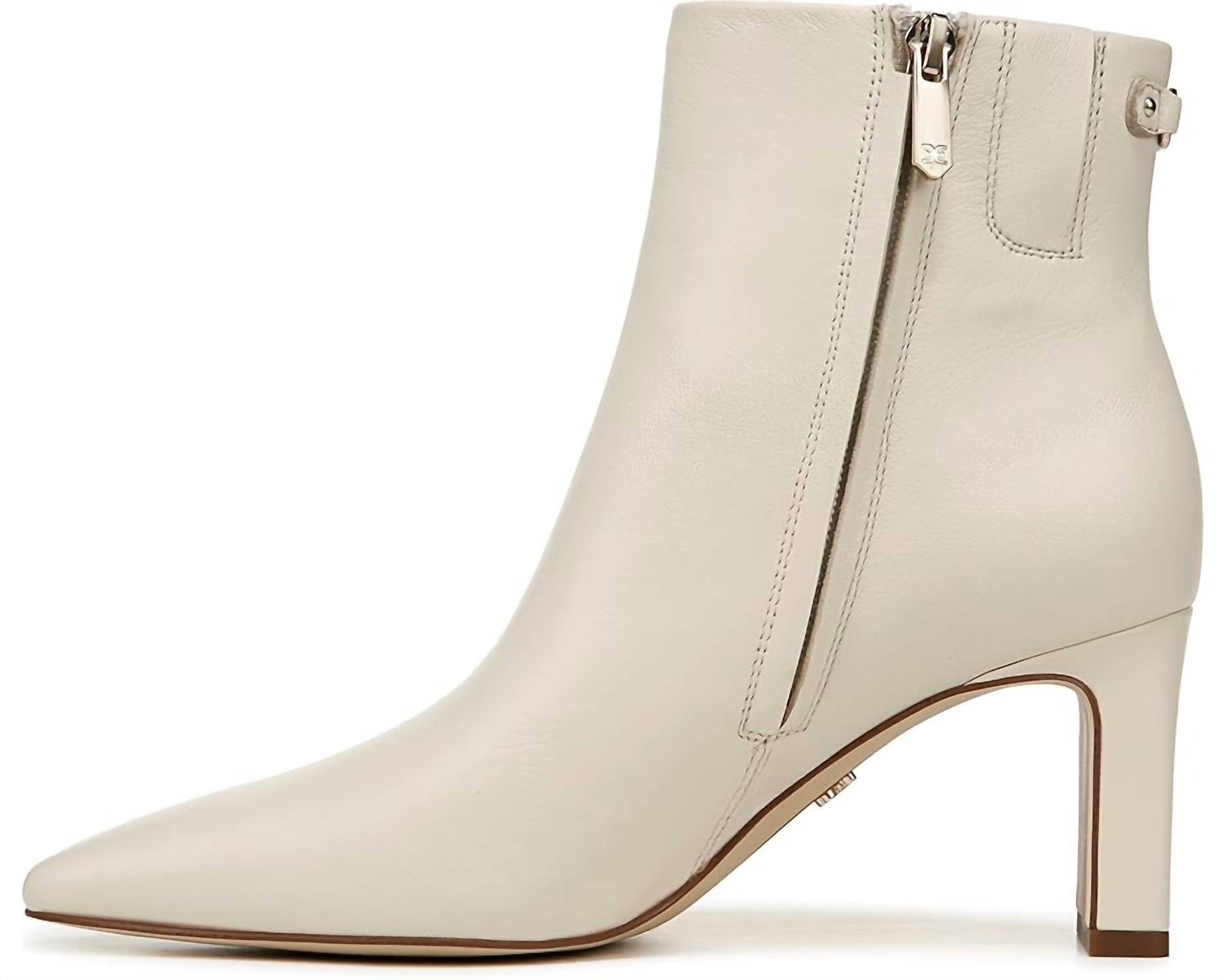 Step up your shoe game with the Women's Saige Boot by Sam Edelman, available in a chic Mod Ivory Leather. These stylish ankle booties feature a pointed toe and a secure zipper closure, poised on an architectural heel with a height of 2.7 inches. Made from premium leather, the Saige Boot ensures both durability and elegance, complemented by a 4.7-inch boot shaft and a calf circumference of 9.8 inches. Whether paired with your favorite little black dress or a trendy wrap dress, these boots promise to elevate any ensemble.