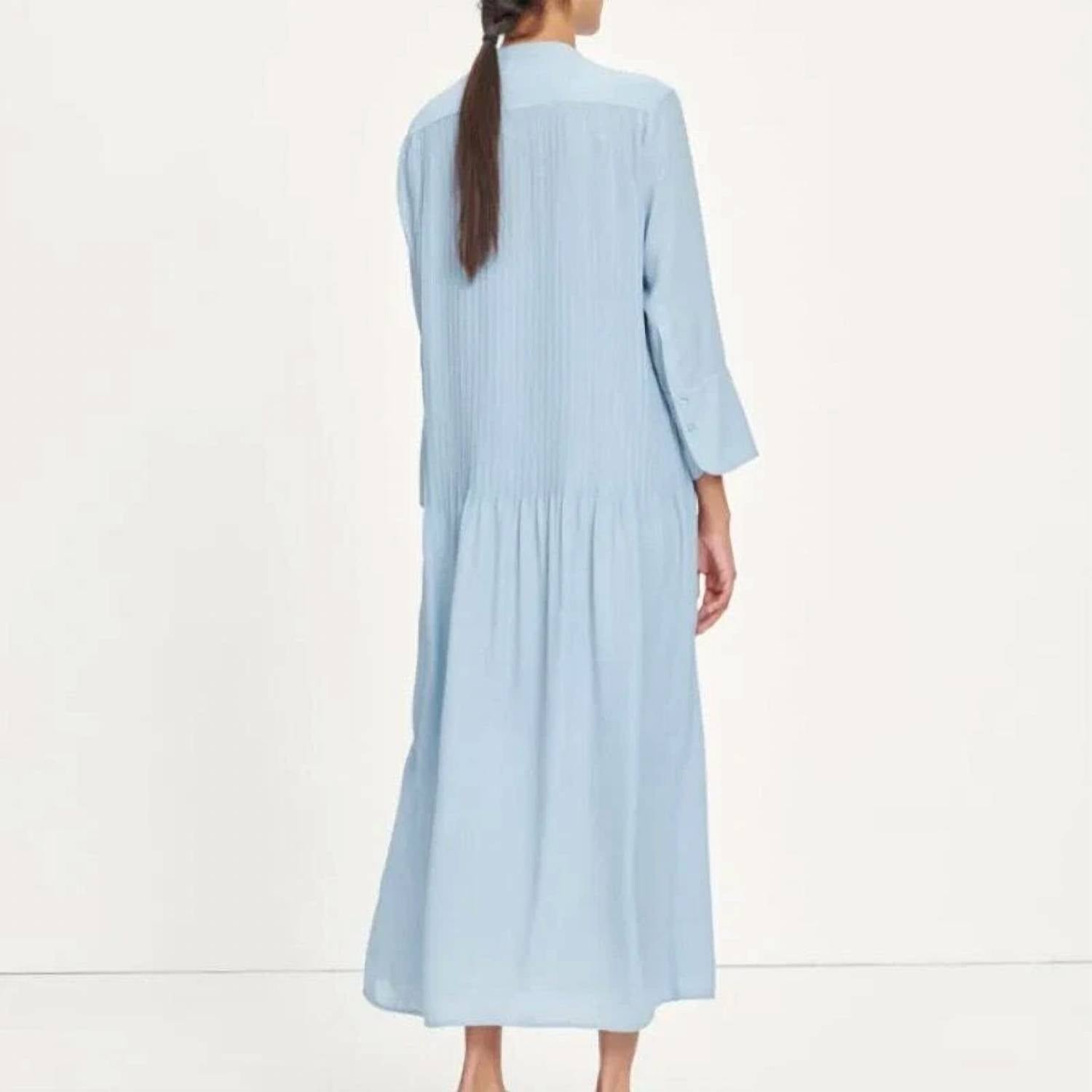 The perfect length dress does exist. Discover the Elm Pintuck Shift Dress by SAMSOE, a sophisticated piece in Dusty Blue perfect for your Easter wardrobe. This midi shirt dress features three-quarter sleeves and a mandarin collar, highlighted by delicate pin-tuck details and a back neck yoke seam. It offers a comfortable, loose fit with a detachable slip dress lining for added versatility. The dress conveniently uses a button closure and is easy to care for, requiring a hand wash followed by laying flat to dry.