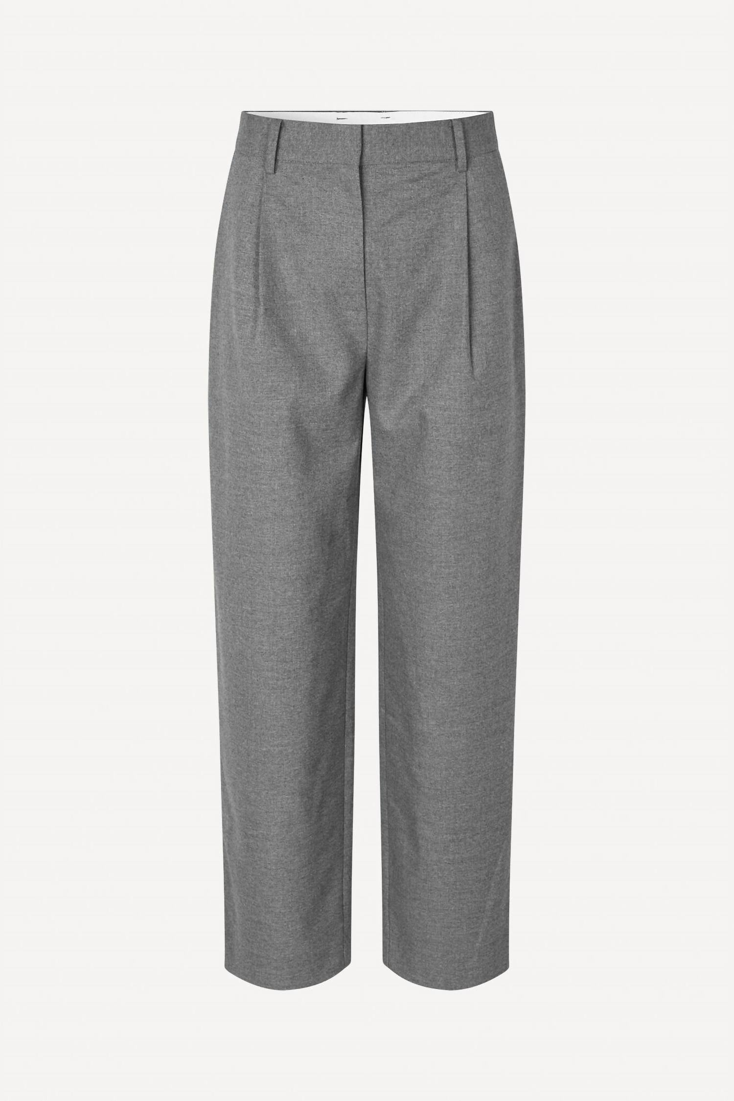 These mid-waist, high-rise trousers feature a regular fit with a wide, straight leg and a mélange look. Crafted from a stretch material blend of 69% Polyester, 29% Viscose, and 2% Elastane with 100% Cotton inserts, they offer both comfort and structure. Features like zipper and hook closure, side slit pockets, and pressed creases enhance their classic appeal.