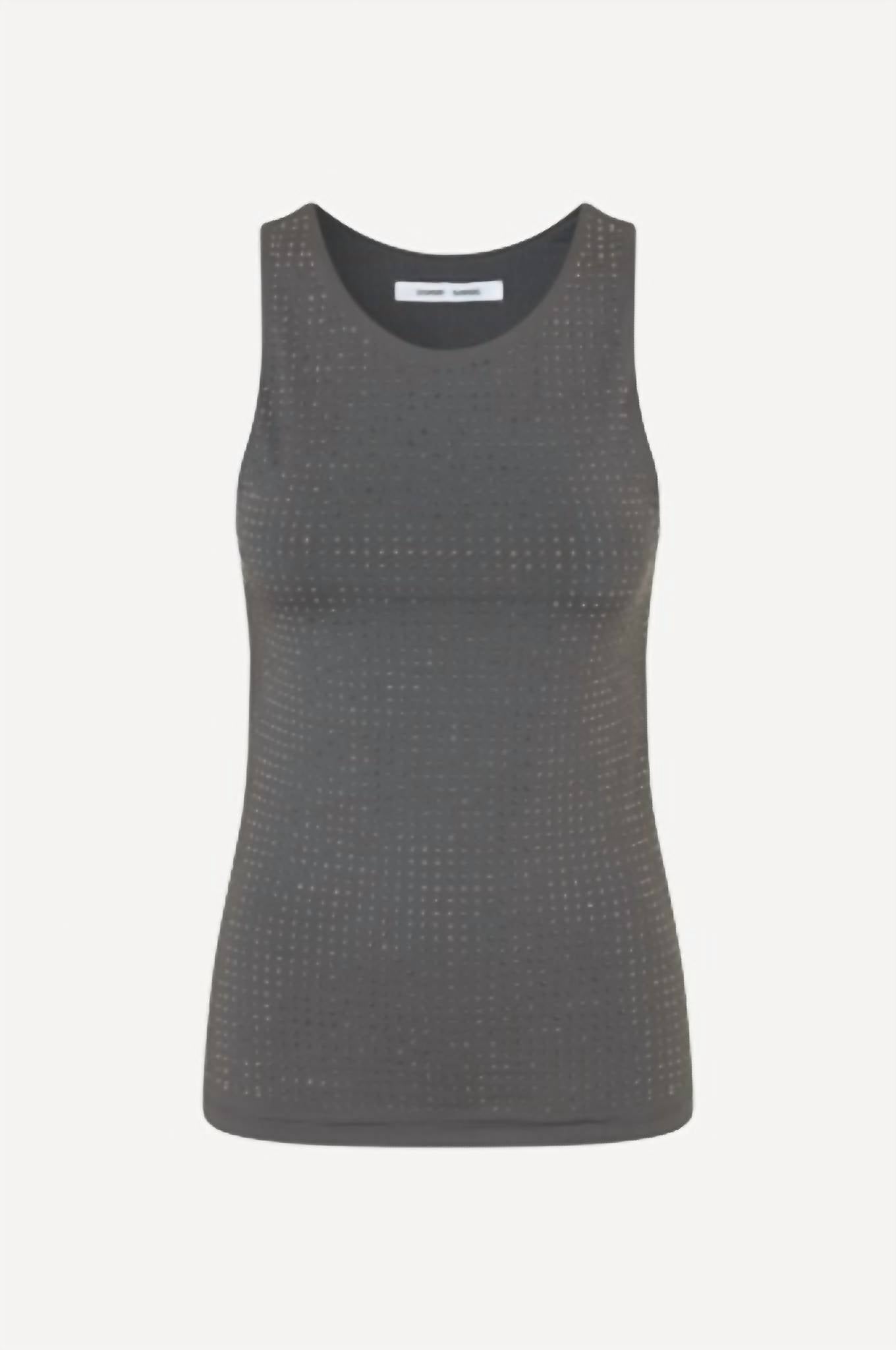 The perfect tank top for those warmer weather seasons. Embrace elegance with the SAMSOE Sachrishell Tank, a women's sleeveless top crafted for evening events. This slim-fit tank is drenched in crystals and features a crewneck design, adding a touch of glamour to your wardrobe. Made from an elastic blend comprising 95% recycled polyester and 5% elastane, this tank offers both style and sustainability. Dive into the Y2K trend with the textured, crystal-studded fabric in the striking Iron Gate color.