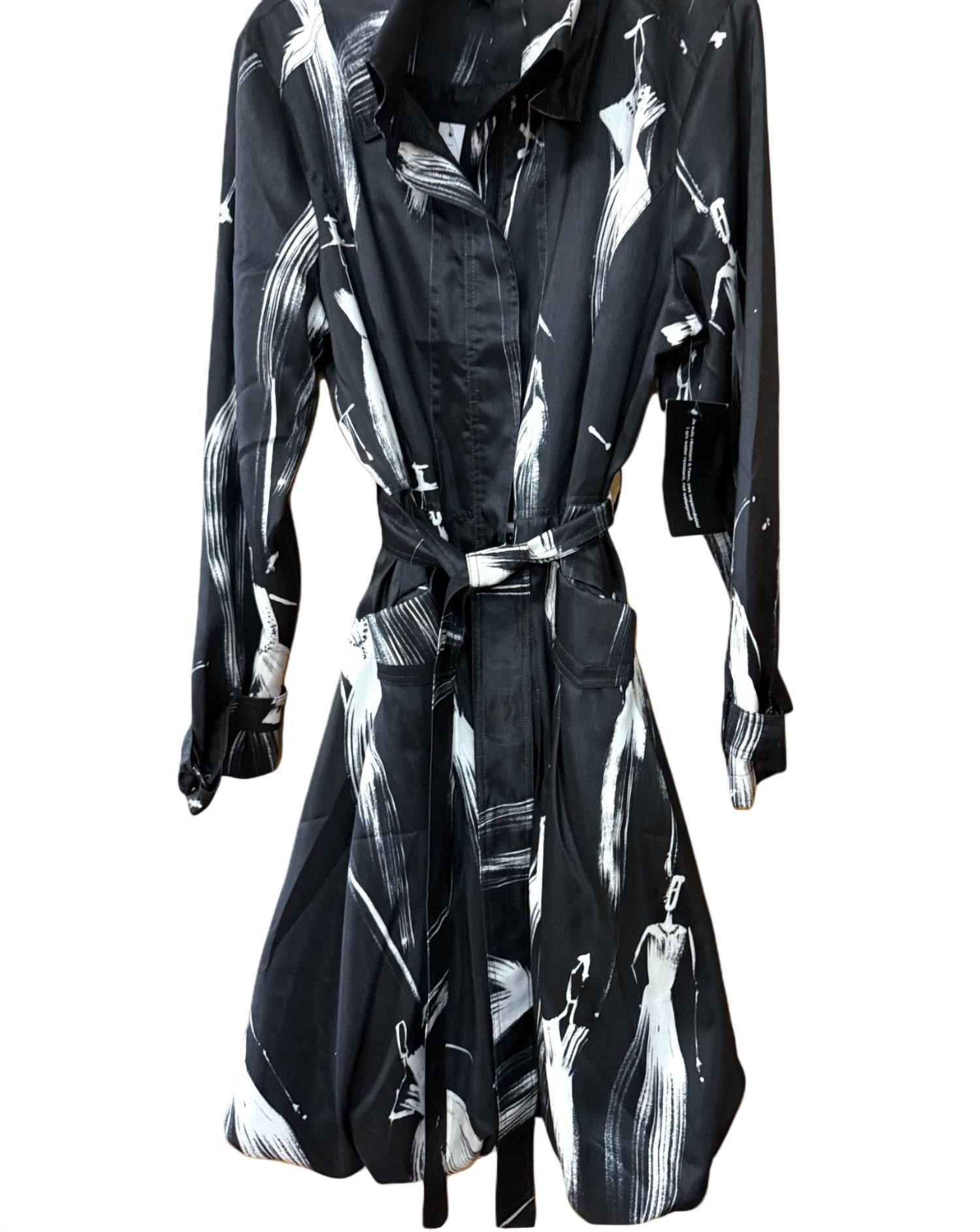 The Samuel Dong 11665 Bubble Coat Dress is a fully lined, long-sleeved trench coat with a fit-and-flare cut and a bubble skirt. It has a black and white graphic print and is made from water-resistant polyester or polyester-nylon blend fabric. The coat features a zipper and snaps closure, a tie belt, and two front pockets.