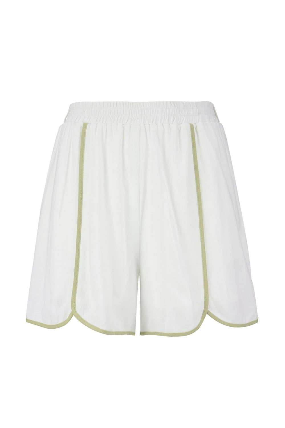 Elasticated waistband, scalloped edge hem, and contrast piping. Relaxed fit, true to size. Length from waist to hem 14.9". Gentle machine wash. 70% Viscose, 30% Linen.