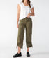 These standard rise cargo pants are made from lightweight micro twill (77% cotton, 20% polyester, 3% spandex) and feature functional side, front, and back pockets. They have a relaxed fit with a zipper/button closure and optional fastener detail at the hem. The waist is 32", front rise is 10.5", inseam is 32", and leg opening is 22". Model is 5'9" wearing size 27. Machine washable.