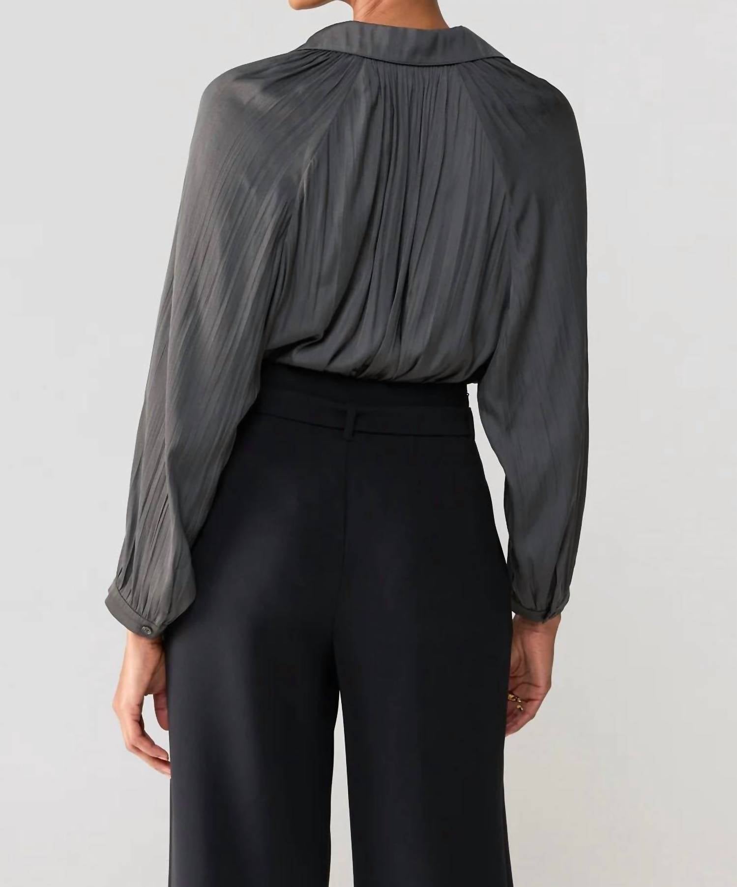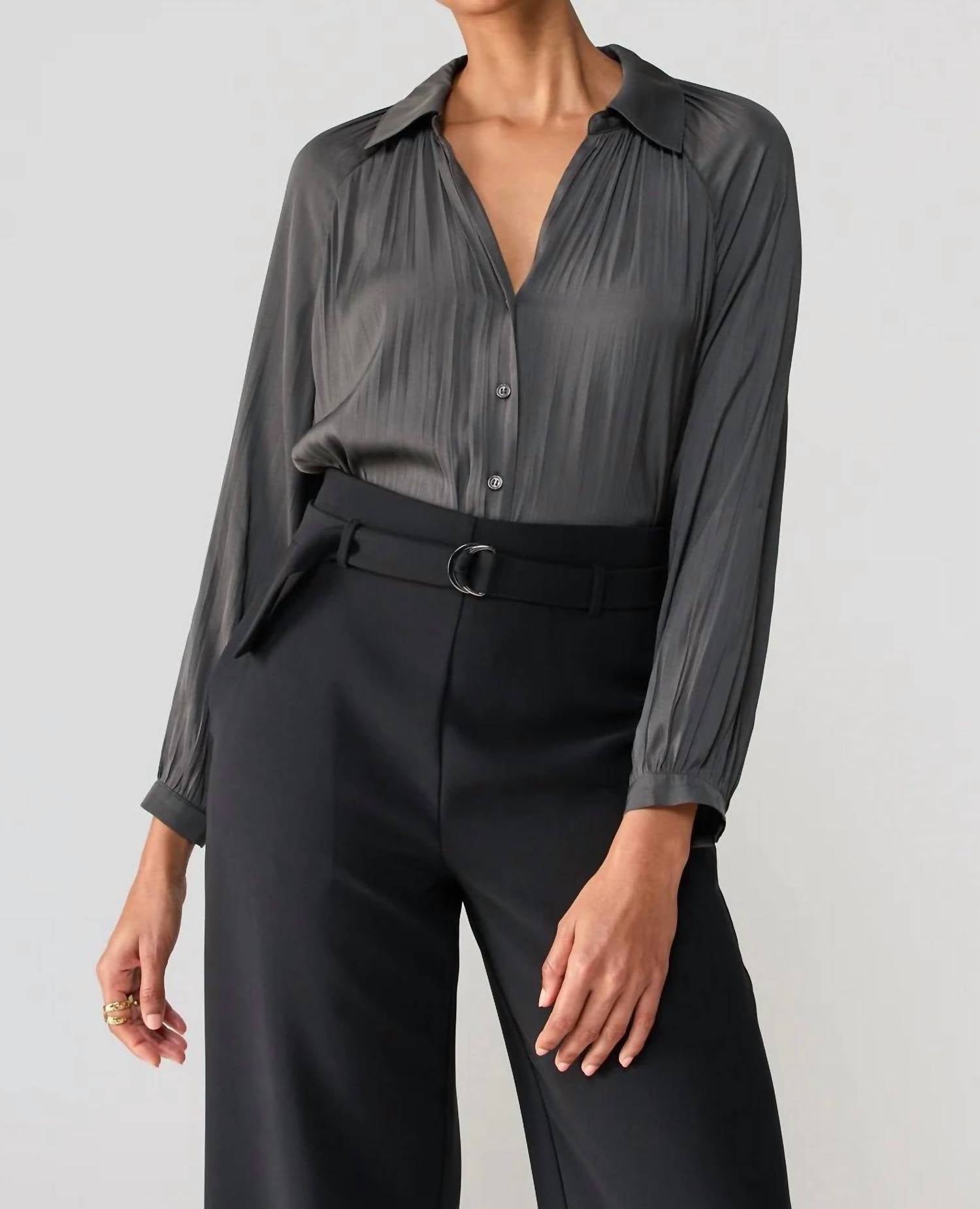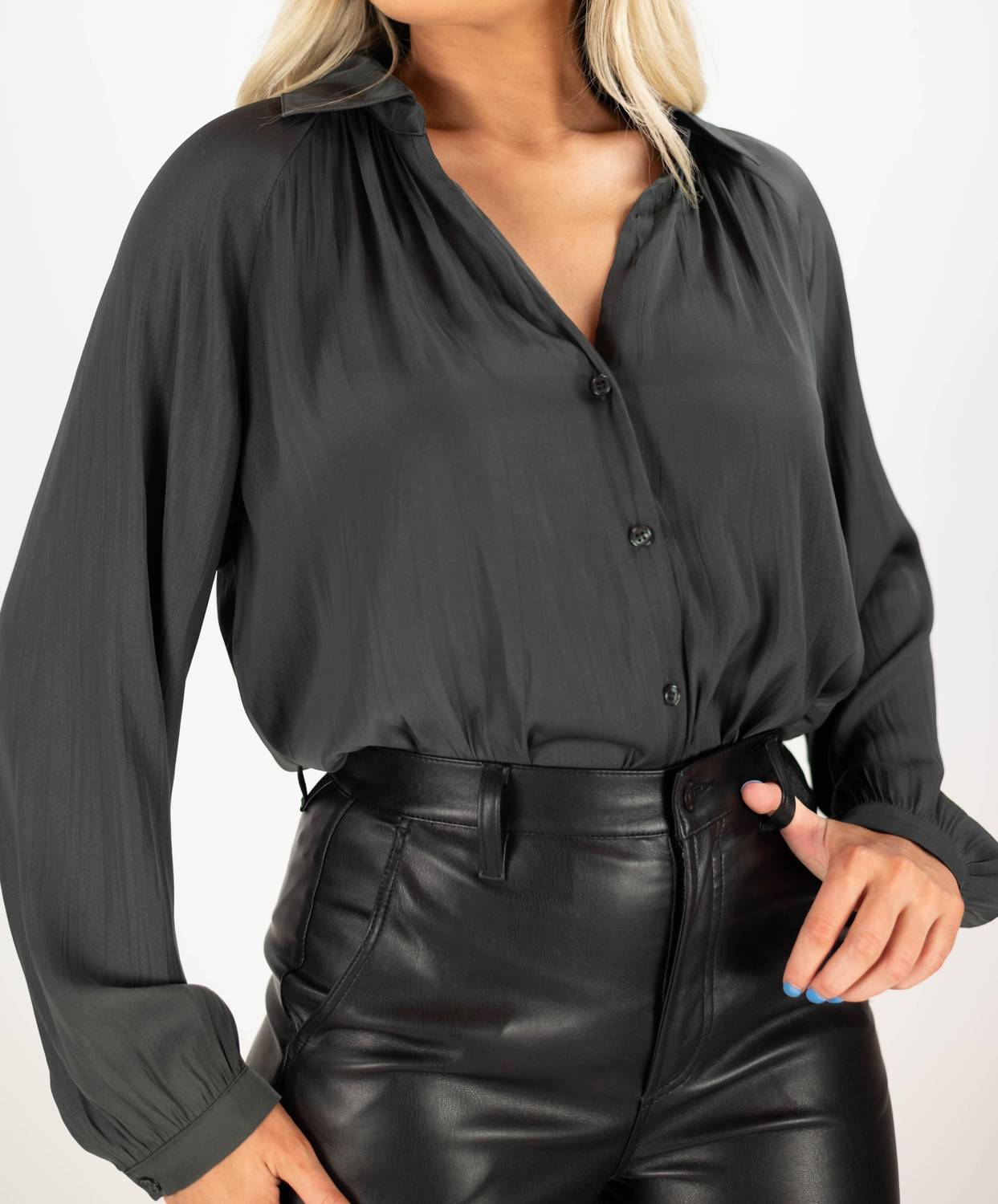 Perfectly tailored and soft to the touch. Introducing the Casually Cute Sateen Blouse by Sanctuary, a sophisticated yet comfortable choice for your wardrobe. With long sleeves and crafted from 100% polyester, this piece features a luxurious crinkle sateen texture in a chic Mineral color. It has a flattering 25" length, a 44.5" bust, and a 31" sleeve, boasting a classic spread collar and button front closure. Made in an imported quality, it is easy to care for—simply machine wash cold. Model is 5'9" and wears a size S.