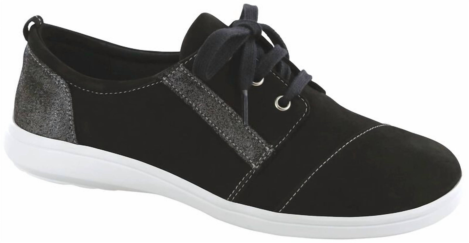 Introducing the Women's Marnie Casual Sneakers by SAS, a chic choice for your summer wardrobe in a stylish Black/Sparkle color. These sneakers feature a removable textile footbed with arch support that molds to your foot, ensuring a customized fit over time. Crafted with a Supersoft® sole filled with millions of tiny air bubbles, these sneakers provide exceptional shock absorption and cushioning. Enhanced with TRIPAD® technology, they offer extra support at the foot's three main pressure points, making them ideal for the busy back-to-school season.