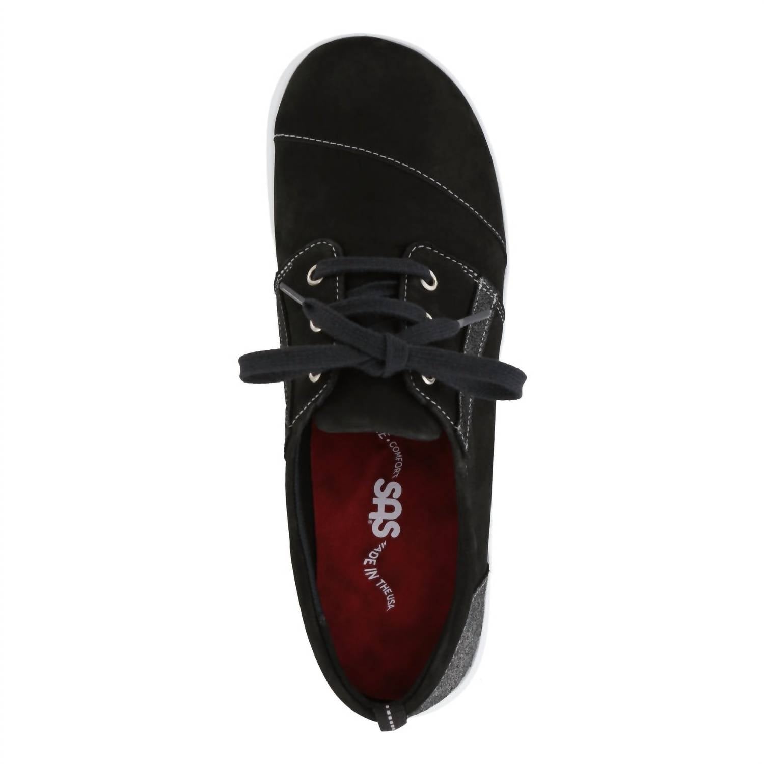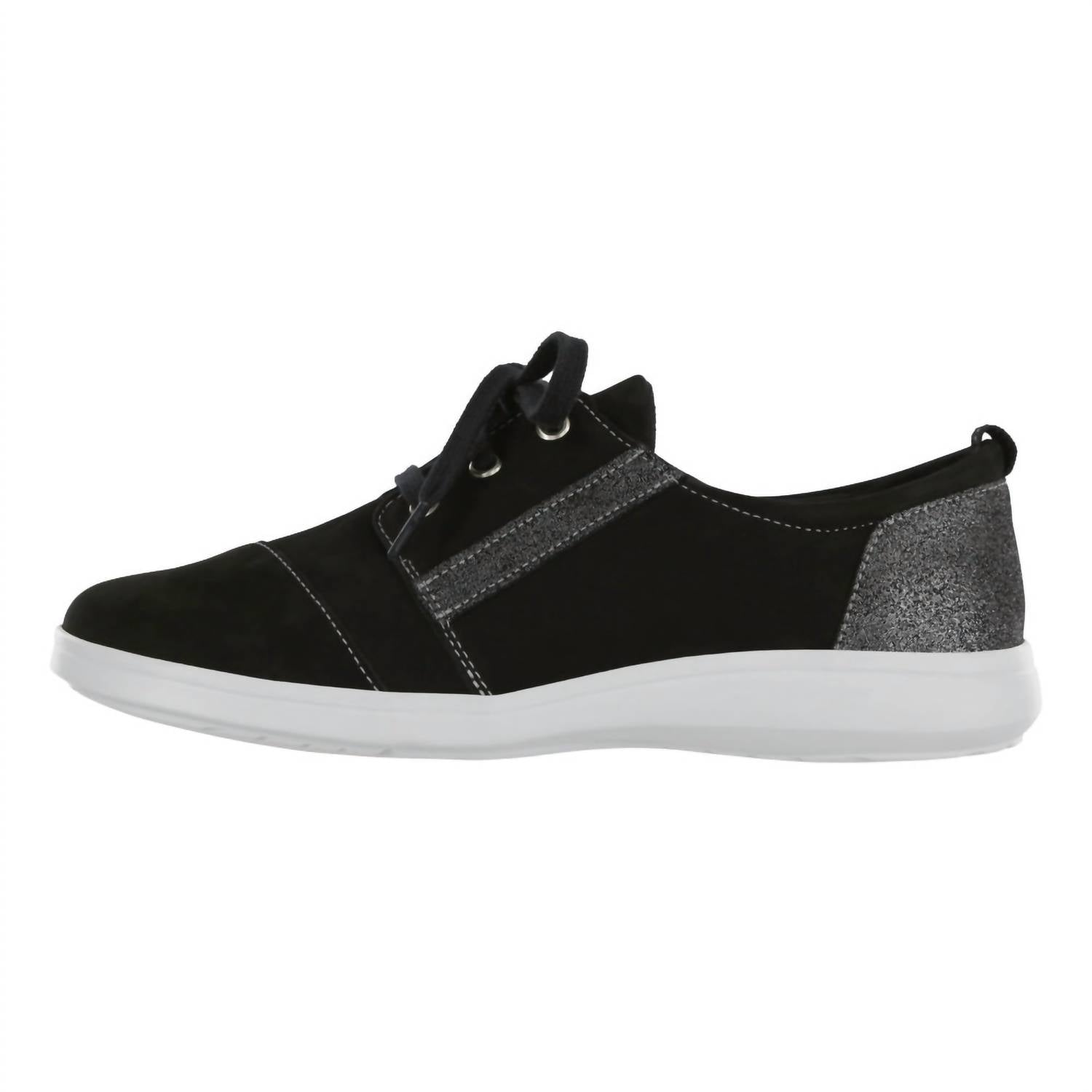 Step up your casual style with the SAS Women's Marnie Lace Up Sneaker in Black/Sparkle, expertly crafted from genuine leather for a chic look. This sneaker boasts Strobel construction, offering a lightweight and flexible fit, while the cushioned upper lining ensures all-day comfort. With a heel height of 1.125 inches and a removable textile footbed, it supports a personalized fit with arch support. Enhanced by TRIPAD® technology and a supersoft sole, it cushions every step with shock-absorption, perfect for traveling and minimalist occasions.
