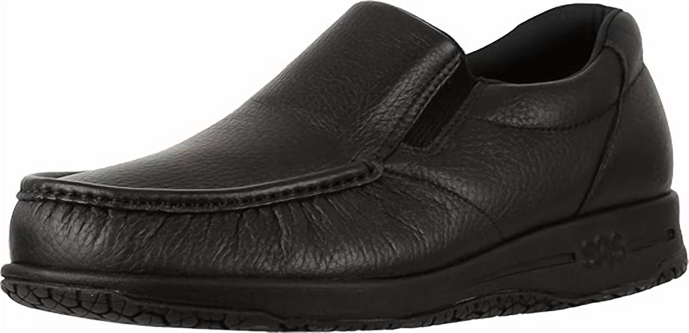 A classic loafer that is both comfortable and polished. These slip-on shoes feature water-resistant leather uppers with moc toe stitching, designed for easy wear with dual side goring for a flexible fit. Approved for Medicare and diabetic use, they offer a lightly cushioned collar for added comfort and a durable rubber sole for reliable traction. Perfect for everyday wear, they combine convenience with supportive design.