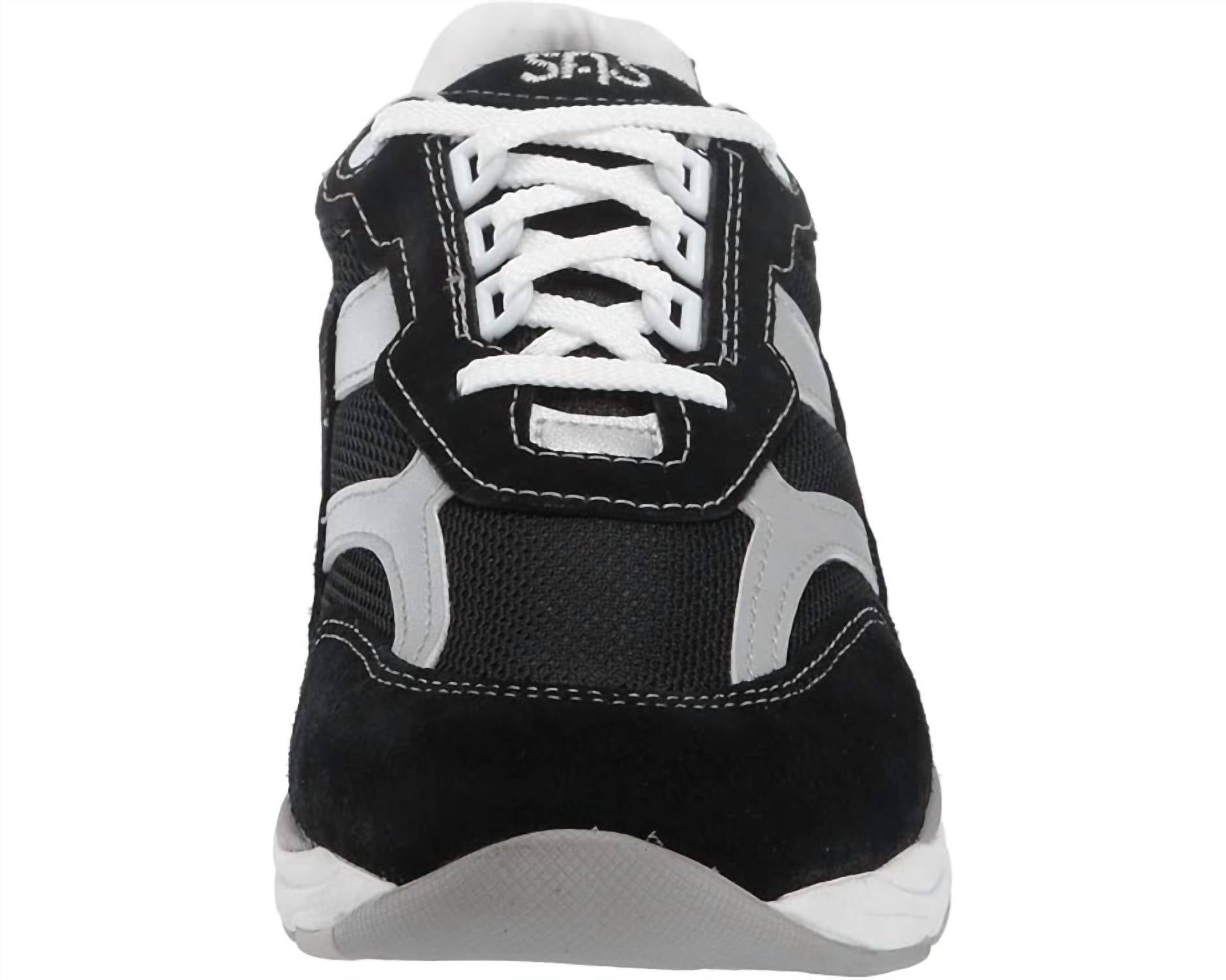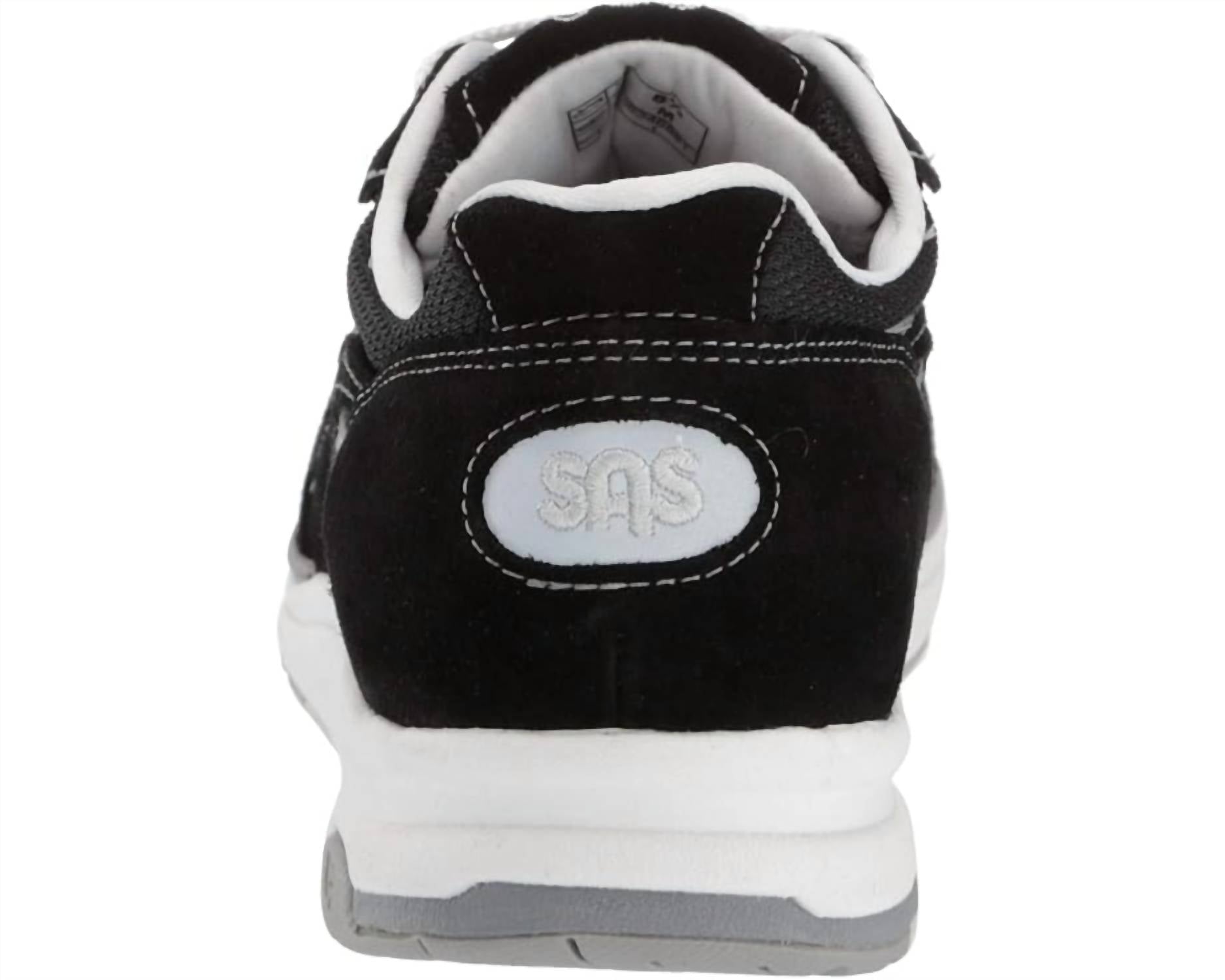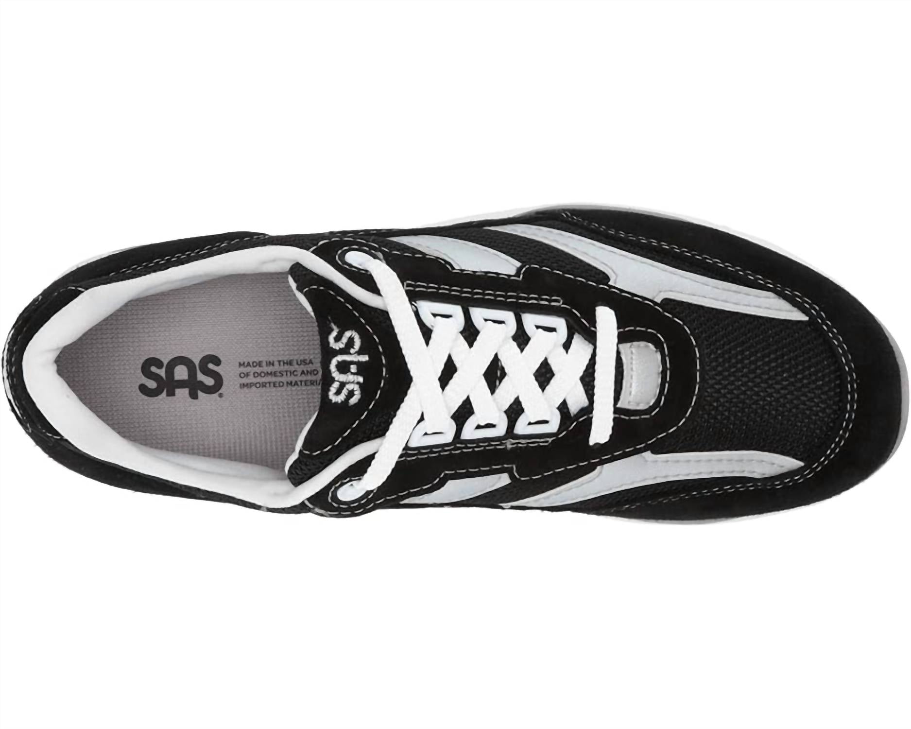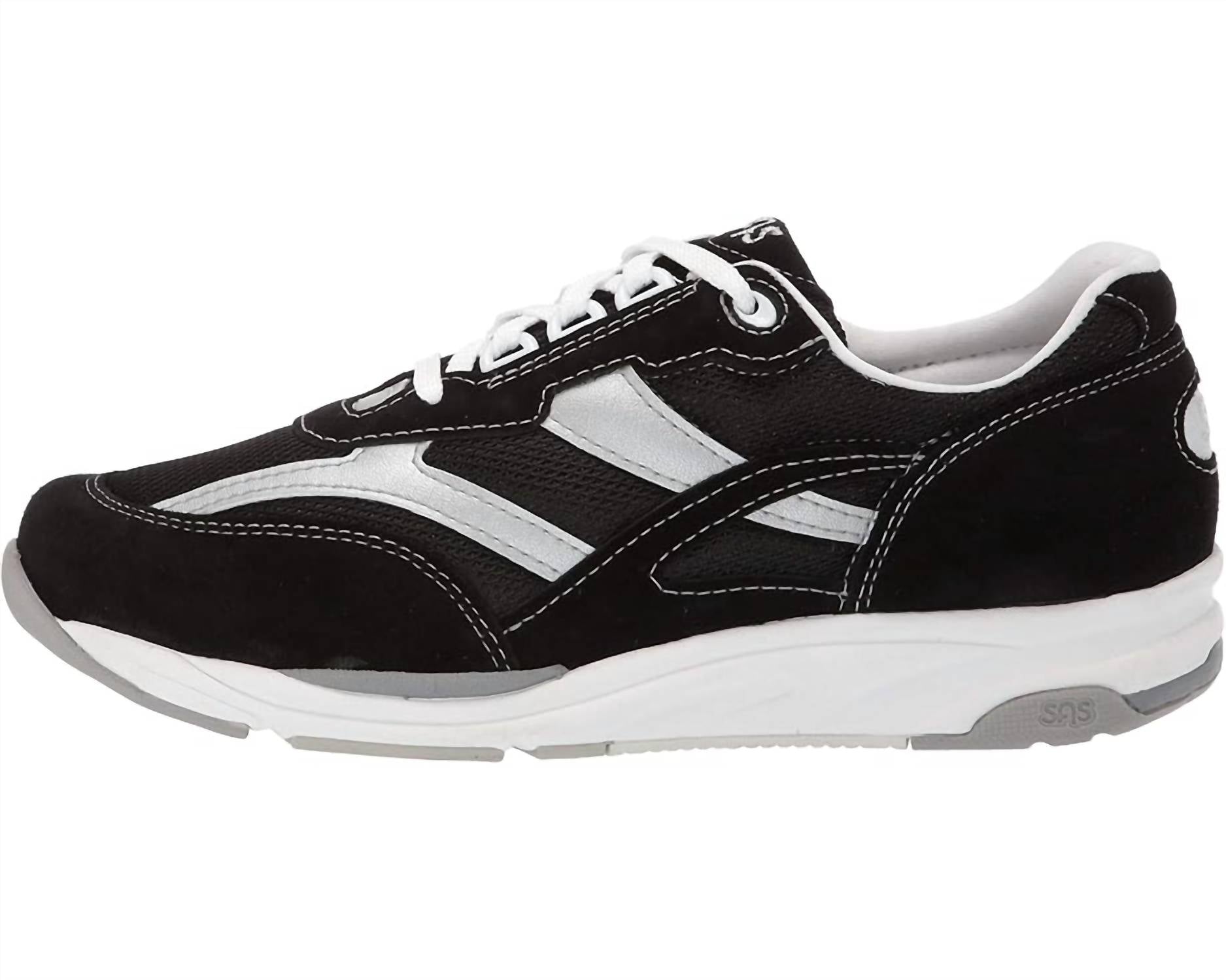Cute, functional, and comfortable. These sneakers check all the boxes. Embrace the weekend with the Women's Tour Mesh Comfort Walking Sneaker by SAS, perfectly designed for athleisure and fitness activities. This black/silver sneaker features a round toe with uppers crafted from a combination of genuine leather and breathable mesh for maximum comfort. Originating from the U.S.A, it offers a traditional lace-up closure and is equipped with a lightweight, shock-absorbing SAS SteadyTrac™ Midsole for added stability. Care instructions are not specified; however, it's approved for Medicare, diabetic needs, and built for all-day support with its CoolSTEP Footbed and Comfort Outsole. Dimensions for size 8: Heel Height: 1 inch, Weight: 10 oz.