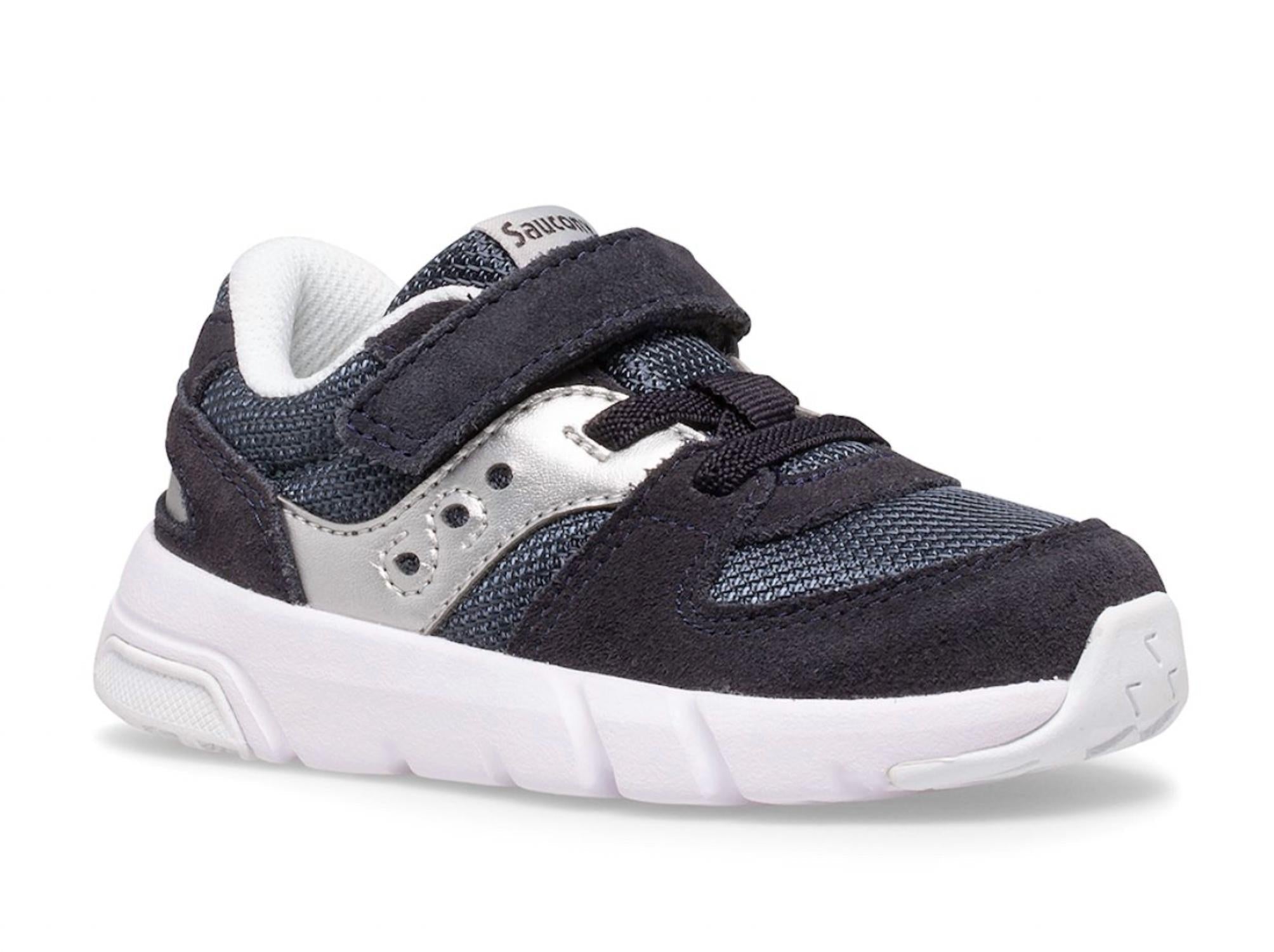 Elevate your little one's style with the Boy's Jazz Lite 2.0 by SAUCONY, featuring a supportive leather and mesh upper in a classic Navy/Silver combination. Designed for easy wear, this sneaker includes an alternative closure and a whimsical smiley face to help identify left from right. Enhanced durability is provided by a reinforced toe and non-marking outsole with rubber traction pods, ensuring comfort and grip for active play. Conveniently machine washable, these sneakers make cleanup a breeze, while recycled PET linings and antimicrobial features keep them fresh and odor-free.