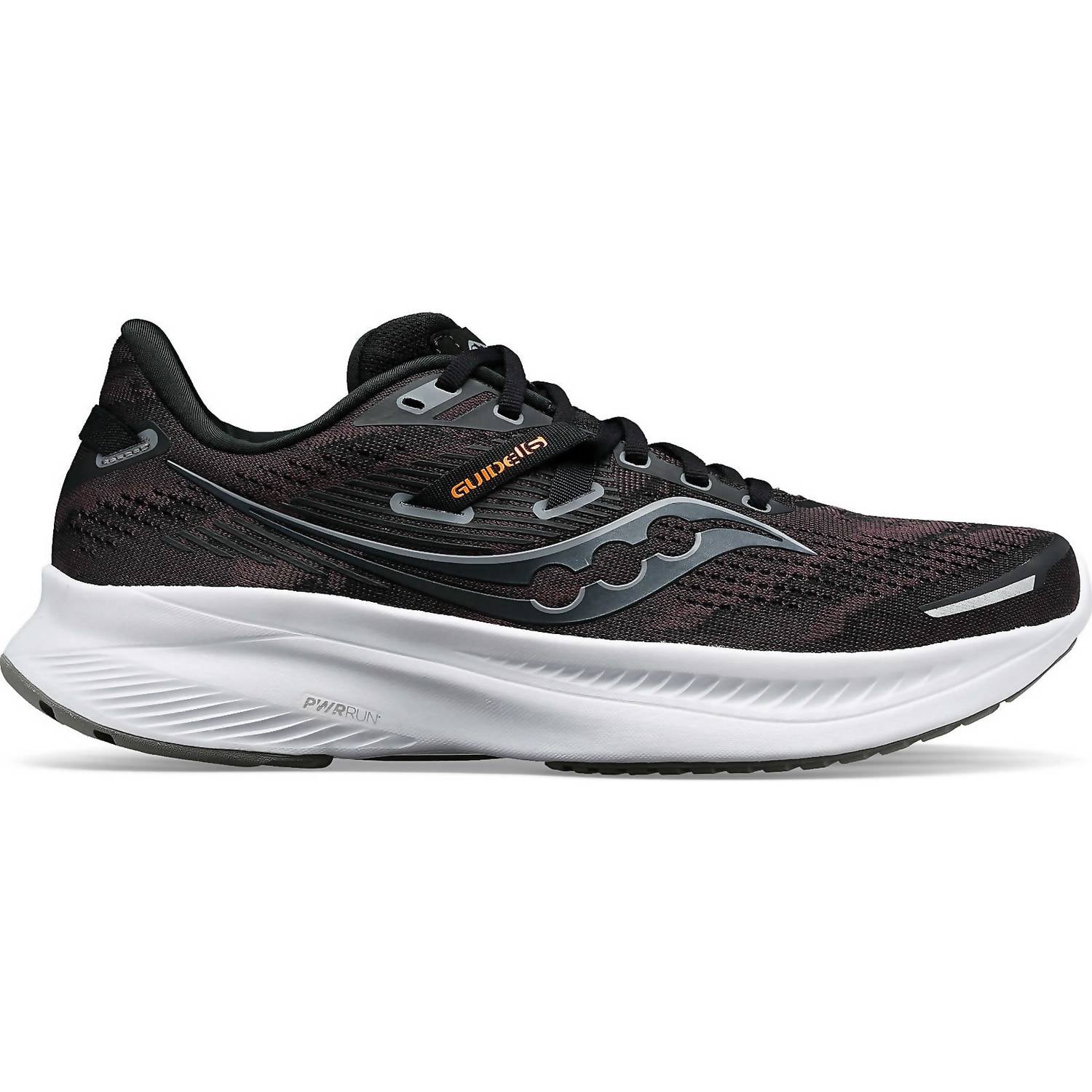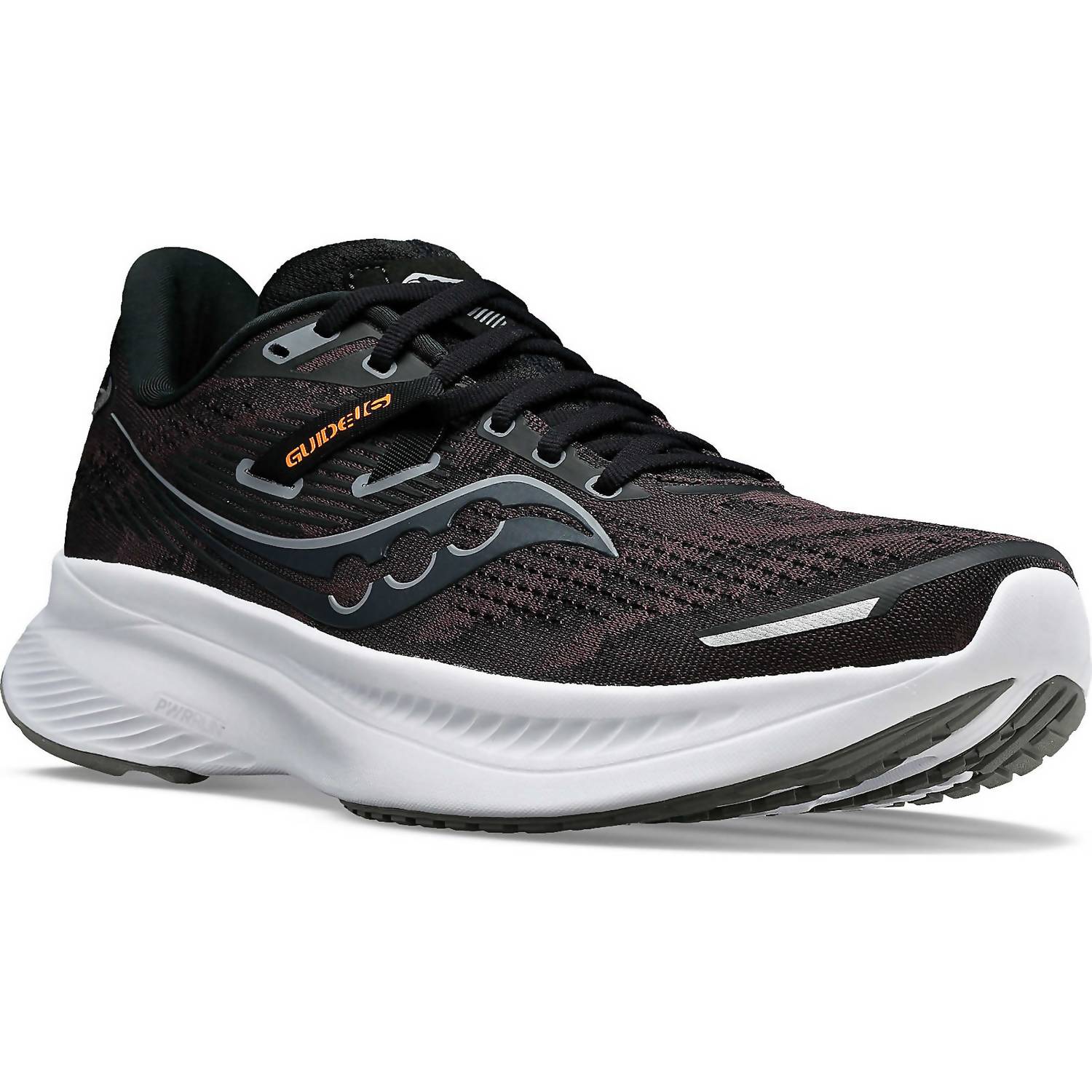 Step up your running game with the Men's Guide 16 Running Shoes by SAUCONY in a sleek black and white design. Featuring a PWRRUN foam midsole, these shoes offer a plush cushioning experience, perfecting your heel-to-toe transitions. With an 8mm heel-to-toe offset and weighing only 8.8oz (249g), they guarantee a structured, cushioned run. Ideal for athletes seeking sustainability, this style is vegan and incorporates recycled materials.
