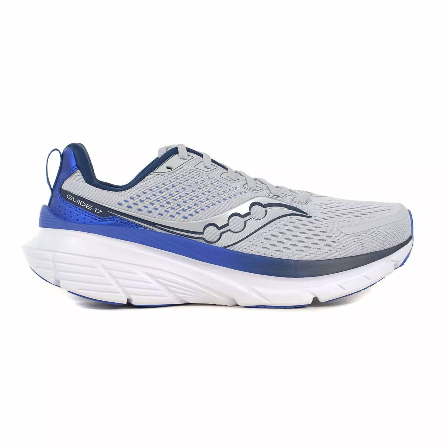 Introducing the Men's Guide 17 Shoes by SAUCONY, crafted for unparalleled comfort and performance. These athletic shoes come in a striking Cloud/Royal color with a medium width and a round toe design for a superior fit. Made with durable rubber, they feature a flat heel with a height of 1" and under, perfect for daily wear and intense training sessions. Ideal for the modern man seeking both style and functionality in his footwear.