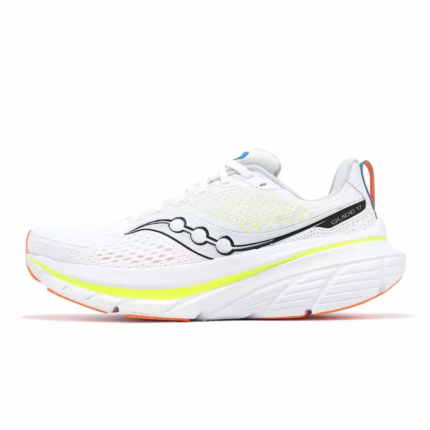 Elevate your athletic performance with the Men's Guide 17 Shoes by SAUCONY, crafted for both style and functionality. These athletic shoes feature a round toe and are made from durable rubber, providing comfort with every step. Designed for men, they come in a sleek white and black color combination, perfect for any sportswear wardrobe. Built with a flat heel under 1", these shoes offer stability and support.