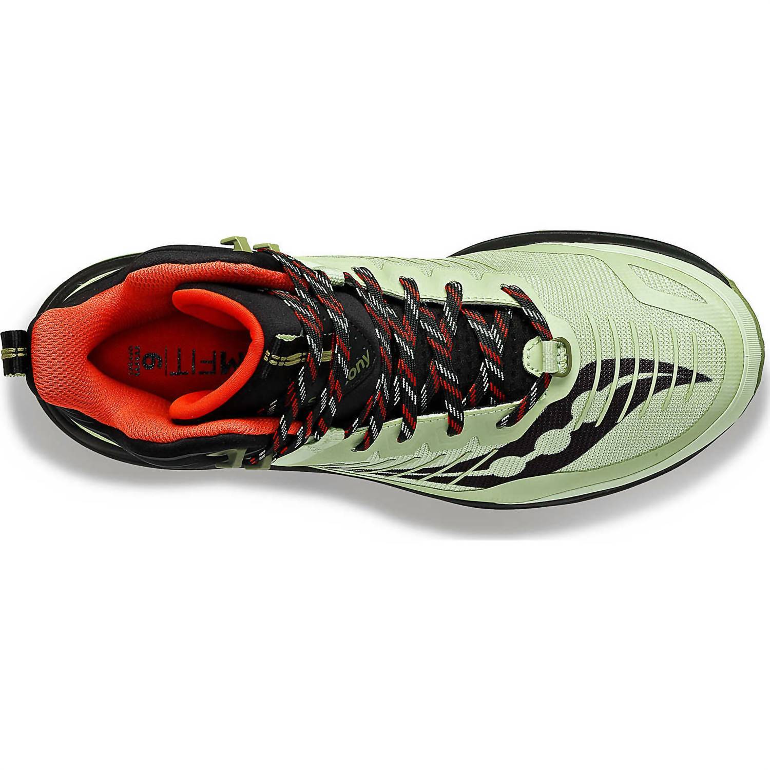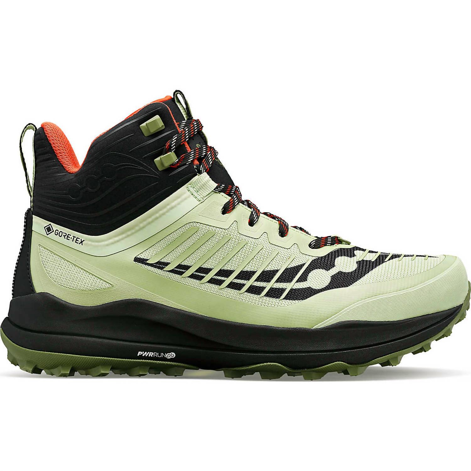 Introducing the Men's Ultra Ridge GTX Shoes by Saucony, the perfect hiking boot replacement for your summer outdoor adventures. These Aurora/Black boots feature a waterproof, mid-cut GORE-TEX® upper to keep your feet dry and protected in wet conditions. With PWRRUN PB foam cushioning and a PWRTRAC outsole, you’ll enjoy a lightweight, springy feel and excellent grip on rugged terrain. These boots are designed for men, boasting a round toe shape and chunky heel for added stability.