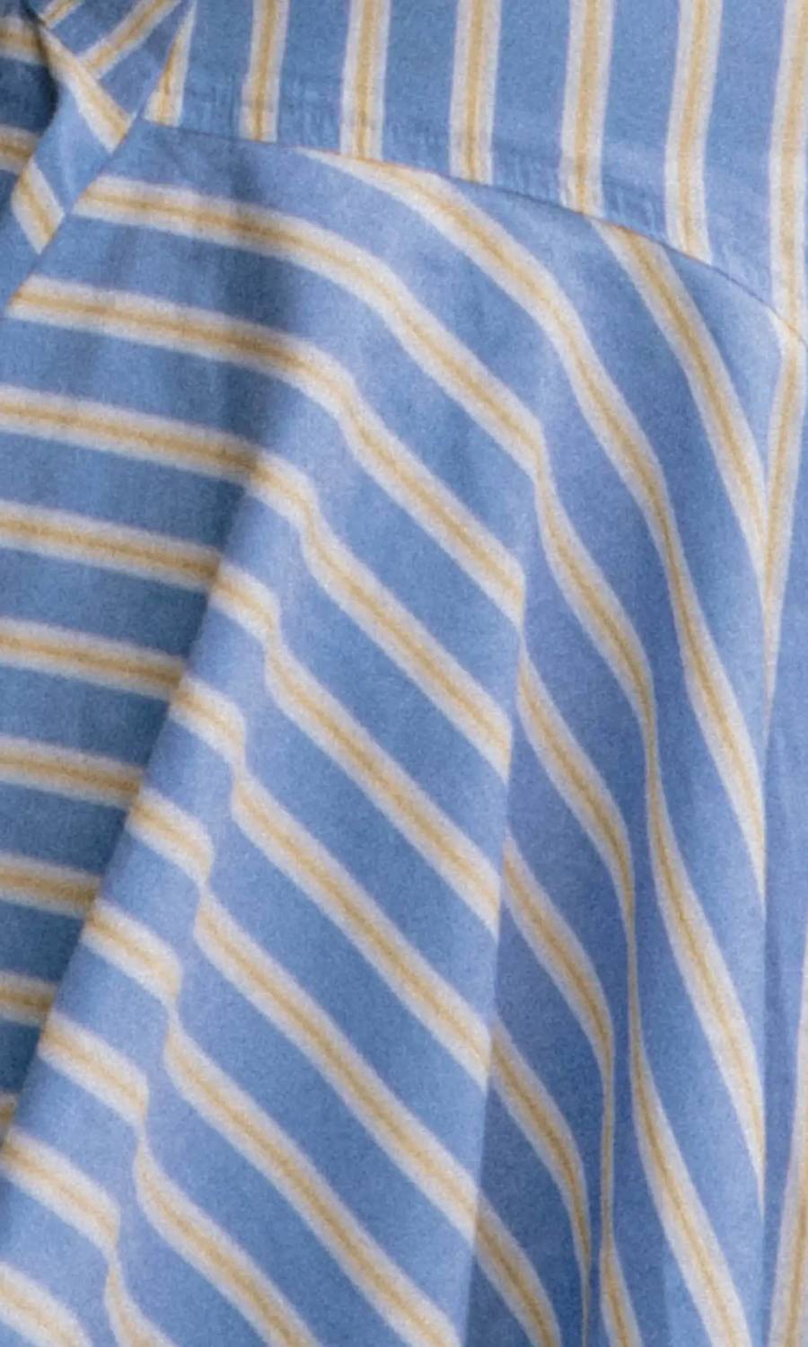 The perfect mini dress for those warmer months. Discover the Naeem Shirt Dress by SAYLOR, a chic Maxi-style piece perfect for effortless vacation dressing. Crafted from 100% cotton, this dress features long sleeves with button cuffs and a stylish stripe print in blue and yellow. With a collared neckline and button closure, it showcases a ruffled hem for added flair. Made in China, it's a breeze to maintain with professional dry cleaning.