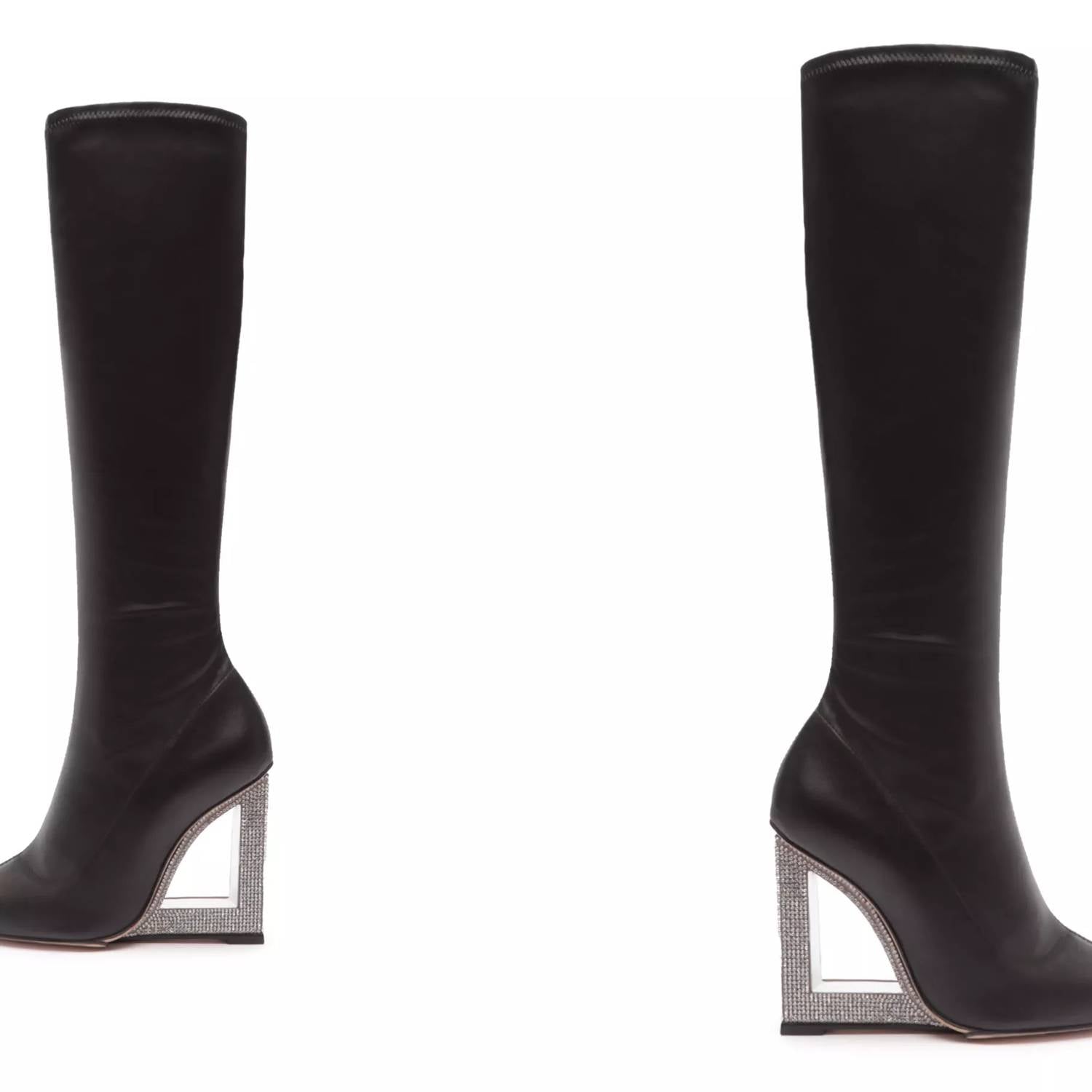 A stylish boot with a comfortable fit and the perfect amount of height. These classic boots are the perfect addition to any outfit and can be worn season after season. The Filipa Pointed Toe Wedge Boots feature a stylish pointed toe design and a convenient pull-on style for easy wear. Crafted with a stretch leather upper, these boots offer a comfortable fit, complemented by a synthetic lining and a durable leather sole. The standout feature is the 4-inch embellished architectural heel, which adds a unique flair to the overall look. With a shaft height of 15 inches and a circumference of 17 inches, these boots are designed to be true to size, making them a fashionable choice for any occasion. Made in Brazil.