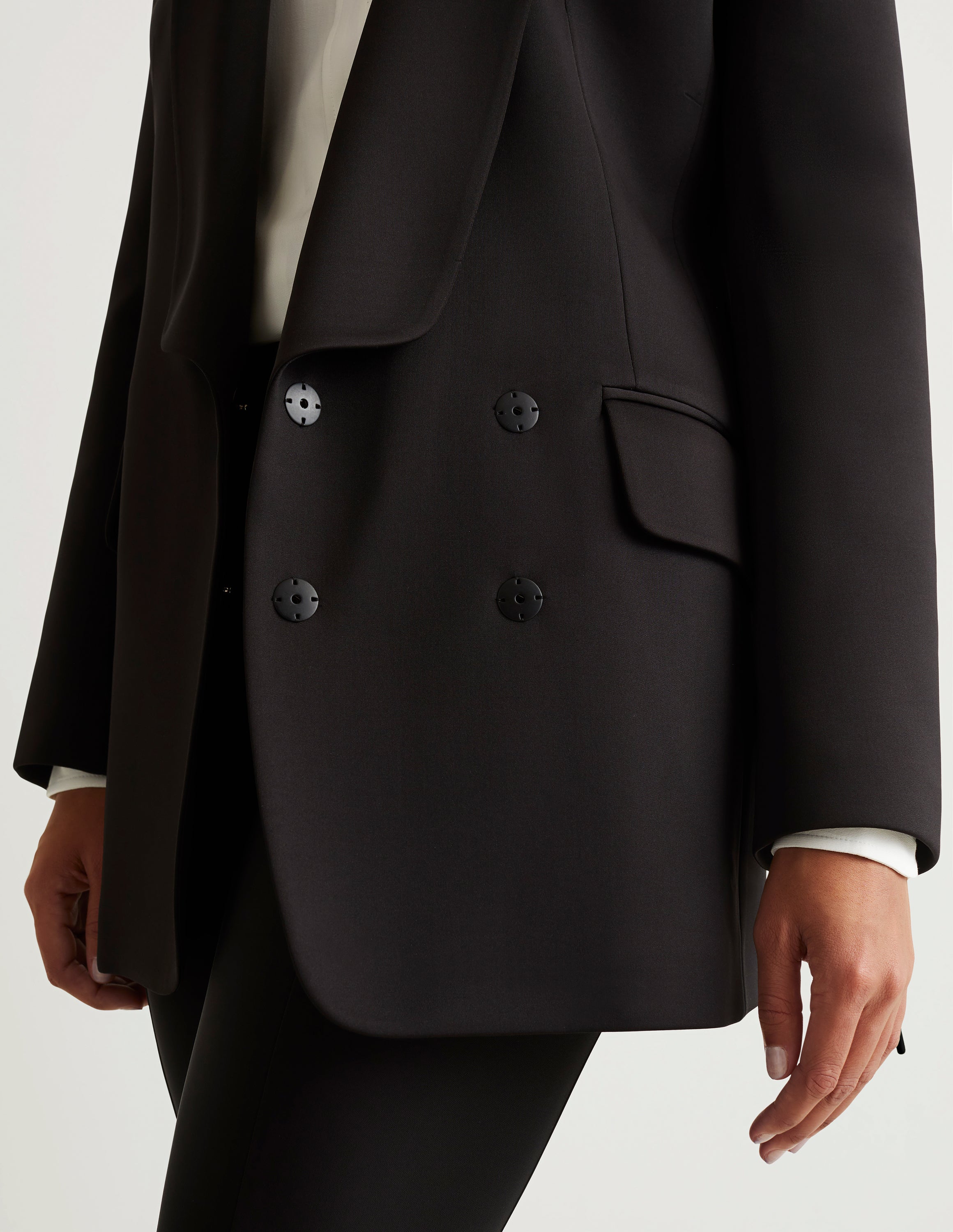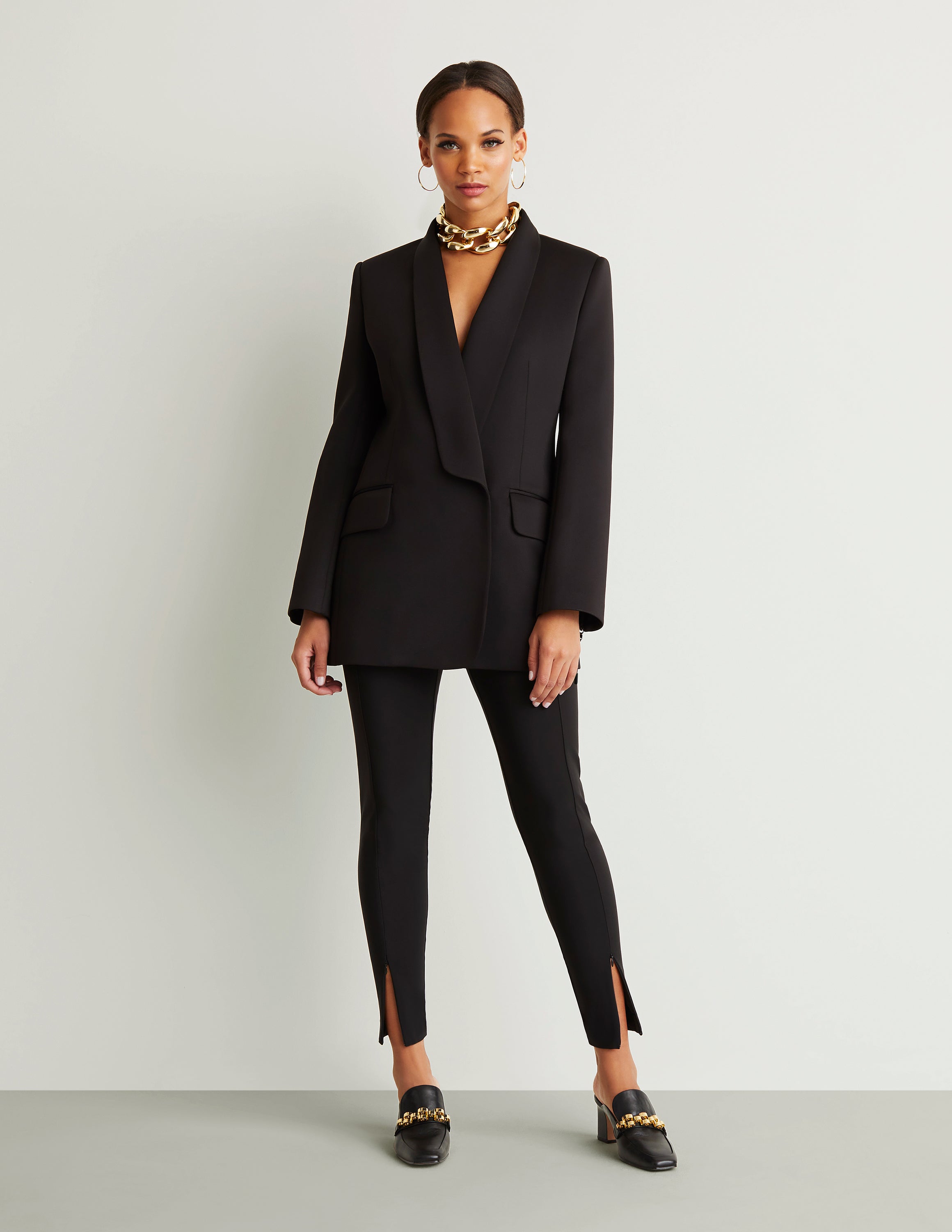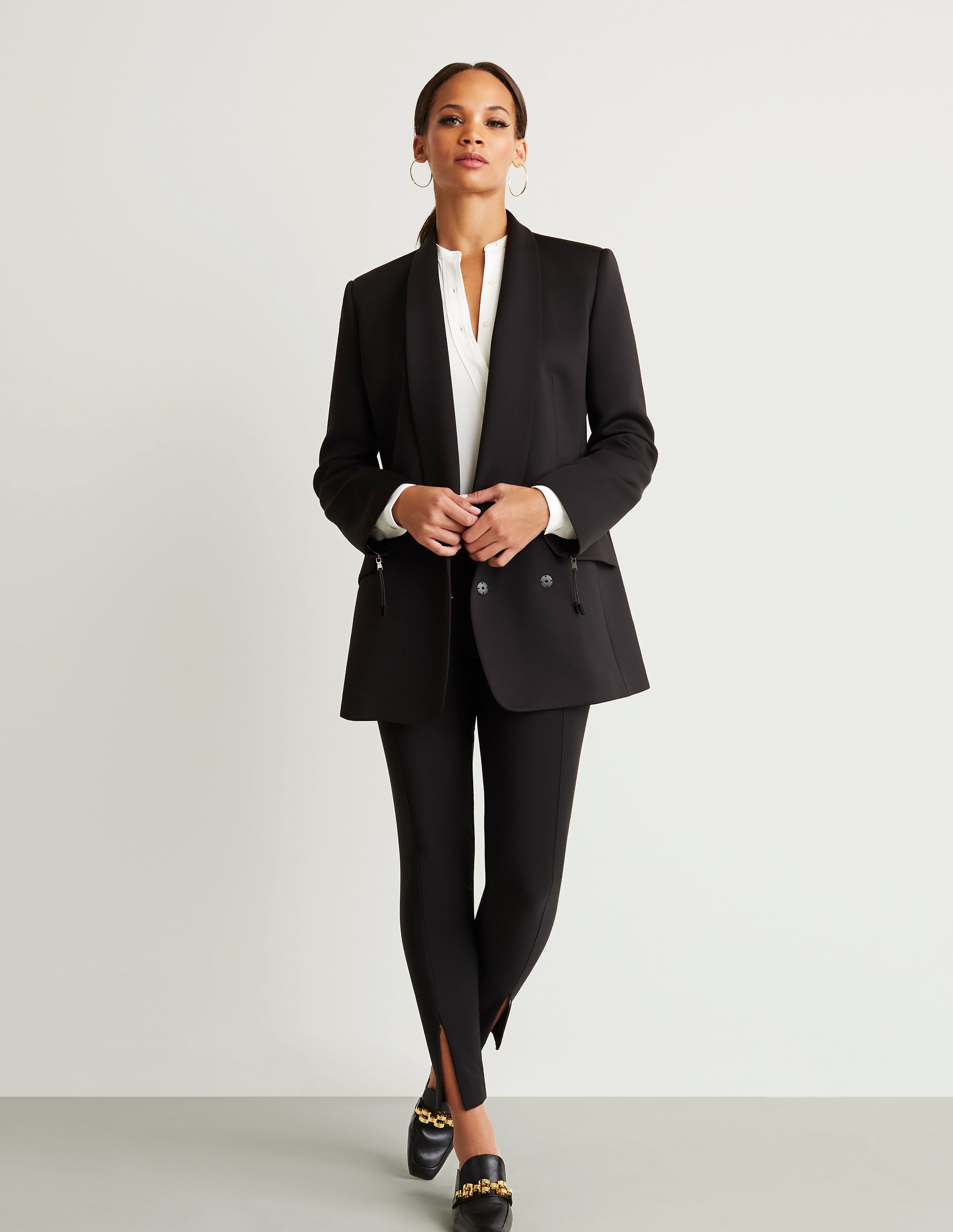 Our favorite fall jacket is a longer length– over 30” to be exact—that can be styled with pants or wear alone as an unexpected tuxedo dress.