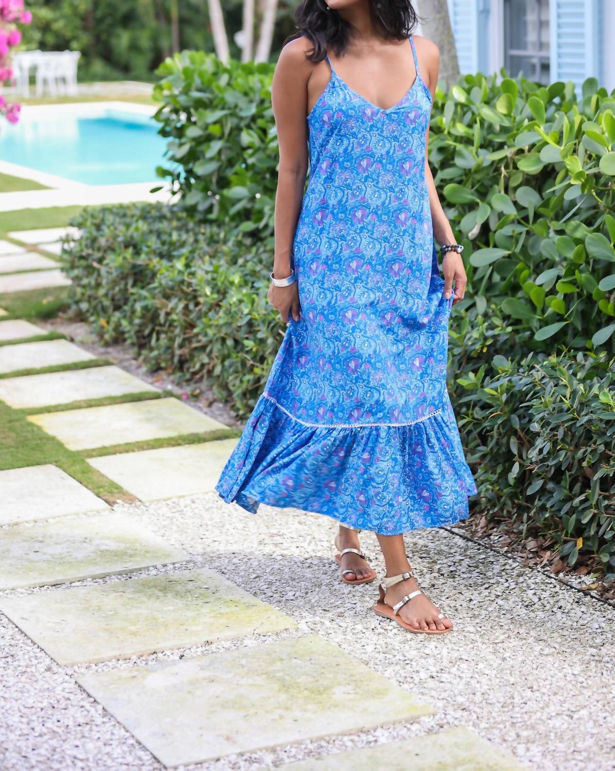 A flattering yet comfortable dress you'll be reaching for season after season. Elevate your vacation wardrobe with the Sea Lustre Day Tripper Slip Dress in Neptune by SEALUSTRE. This boho-chic dress features adjustable spaghetti straps and a playful ruffle hem with delicate lace details, making it perfect for summer adventures. Made from 100% Rayon, it offers a breathable and lightweight feel. Care instructions suggest hand washing cold with a mild detergent and hanging to dry without wringing or twisting.