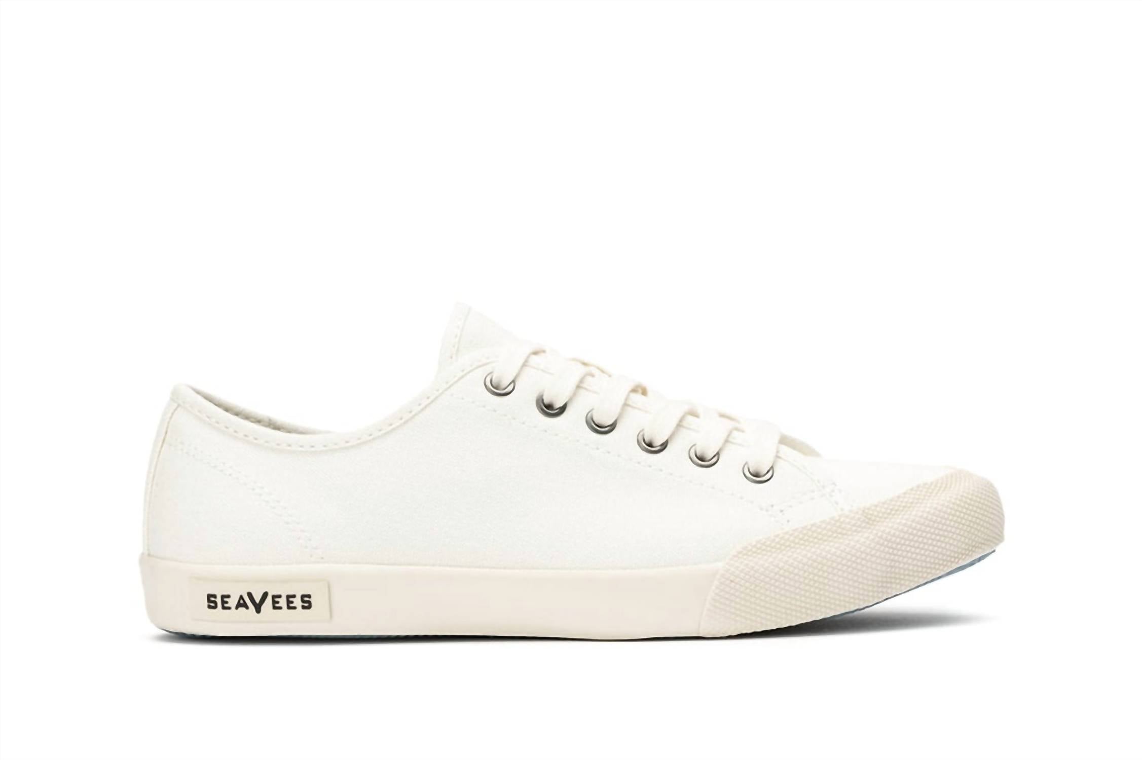 The Women's Monterey Sneaker by SeaVees is the perfect summer vacation footwear combining comfort and style. Made from a cotton blend, these white sneakers are inspired by the easygoing vibes of the 1967 Monterey Pop Festival. The flat heel and round toe design provide all-day comfort with a cushy memory foam footbed featuring airflow channels. Finished with a durable natural rubber outsole, these sneakers are crafted using a time-honored vulcanization process.