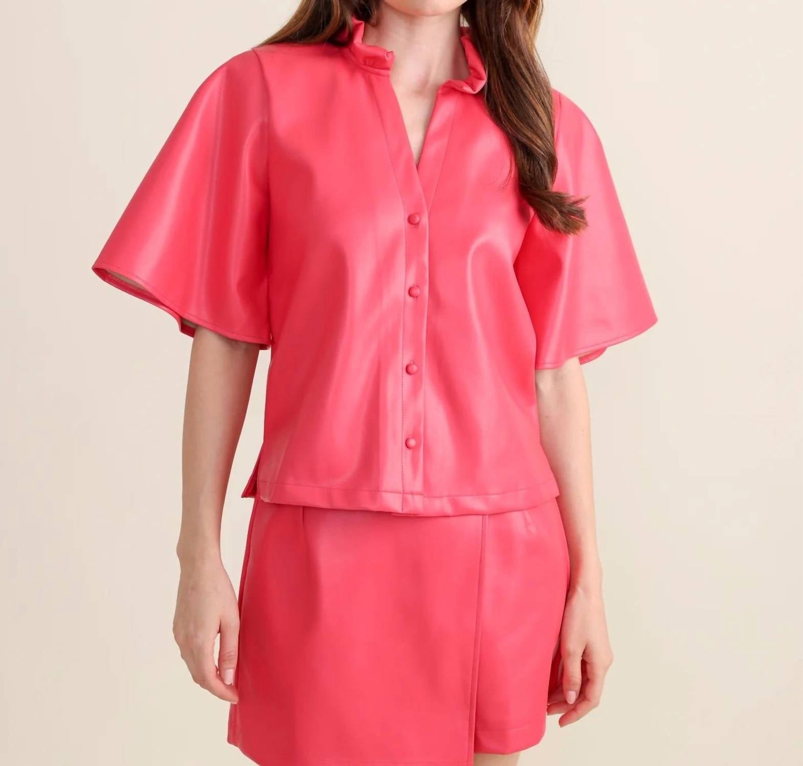 A classic button down shirt that will never go out of style. Introducing the Women's Kara Top by Sedge, a bold addition to any wardrobe with its striking Begonia hue. This top boasts dramatic short leather sleeves, a stylish ruffled collar, and a sophisticated V-neck. Composition: 100% Polyurethane. Closure: Button closure. Please note, this item is spot clean only and should not be ironed. Perfect for vacation or a night out, this piece runs true to size.