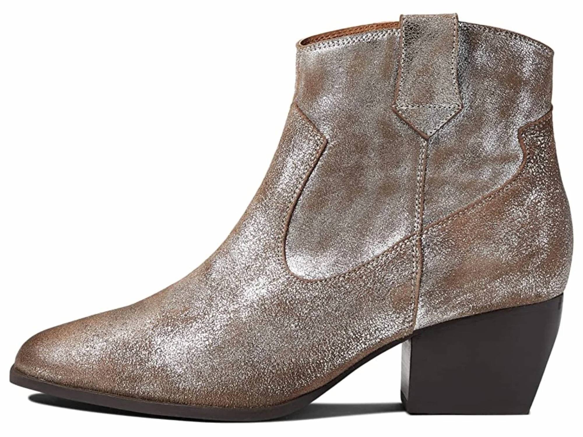 Say hello to the perfect, most versatile boot. The ankle height makes this style easily transition from day to night. Wear them with your favorite skinny jeans and tee for a more laid back look, or pair them with your favorite mini dress and jacket for a night out on the town. Step into style. Featuring a sleek western-inspired design in a pewter finish. Ankle boot boasts a distressed suede look with thermoplastic polyurethane construction. Offering durability and chic appeal. Designed with a shaft height of 10.25 inches and a round toe. Block heel combines comfort and fashion effortlessly. Low heel height.