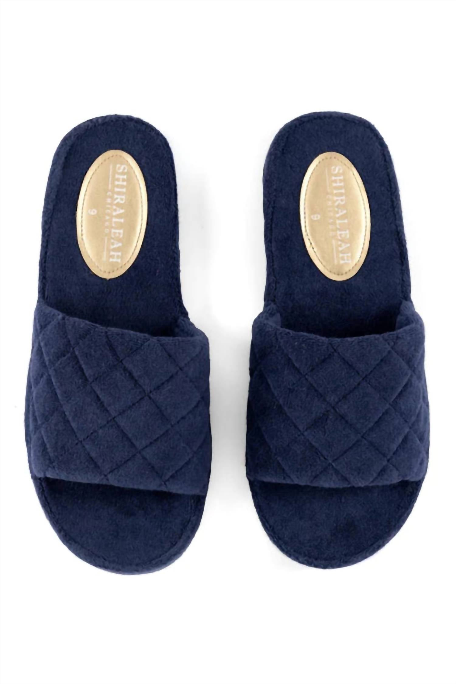 Elevate your summer look with the Women's Terry Pool Slides by Shiraleah, crafted in a chic navy hue. Made from soft terrycloth, these open-toe slippers offer both comfort and durability. Their flat heel and minimalist design make them ideal for lounging at home or stylish days by the water. Perfect for a dinner party or casual Thanksgiving gathering, these slides bring a fun, colorful touch to any winter outfit.