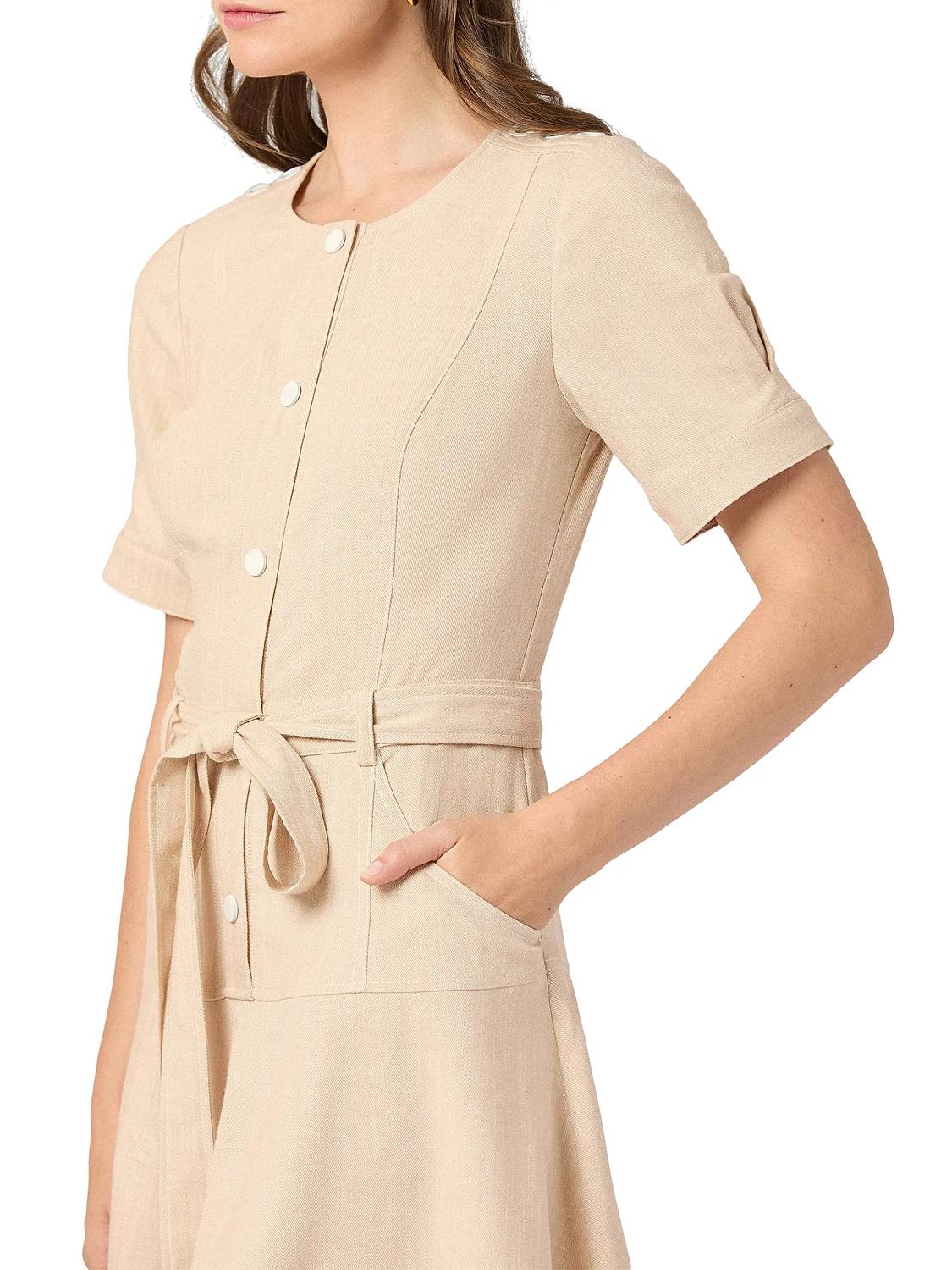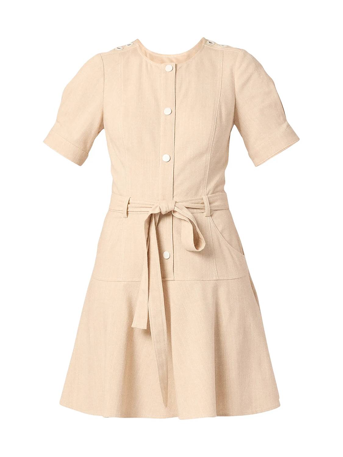 Presenting the Shoshanna Brooks Minidress, an elegant piece in sand crafted from chambray with a self-tie belt for a flattering fit. Featuring short sleeves, a spread collar, and functional side slip pockets, this A-line silhouette offers comfort and style. Made from a blend of 49% Cotton, 32% Polyester, 17% Viscose, and 2% Spandex, the dress measures approximately 36.5 inches from shoulder to hem. Closure: Front snap closure. Care: Dry clean only.