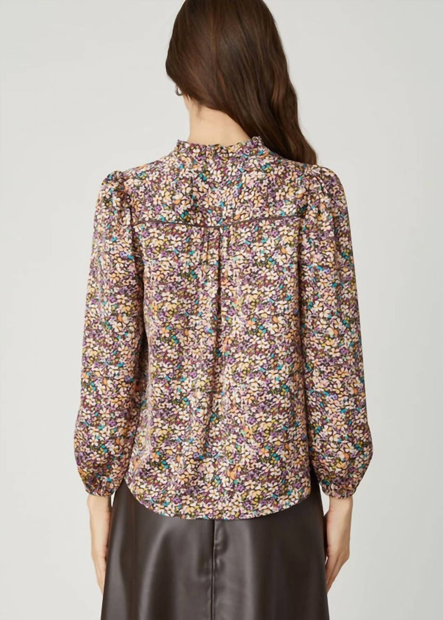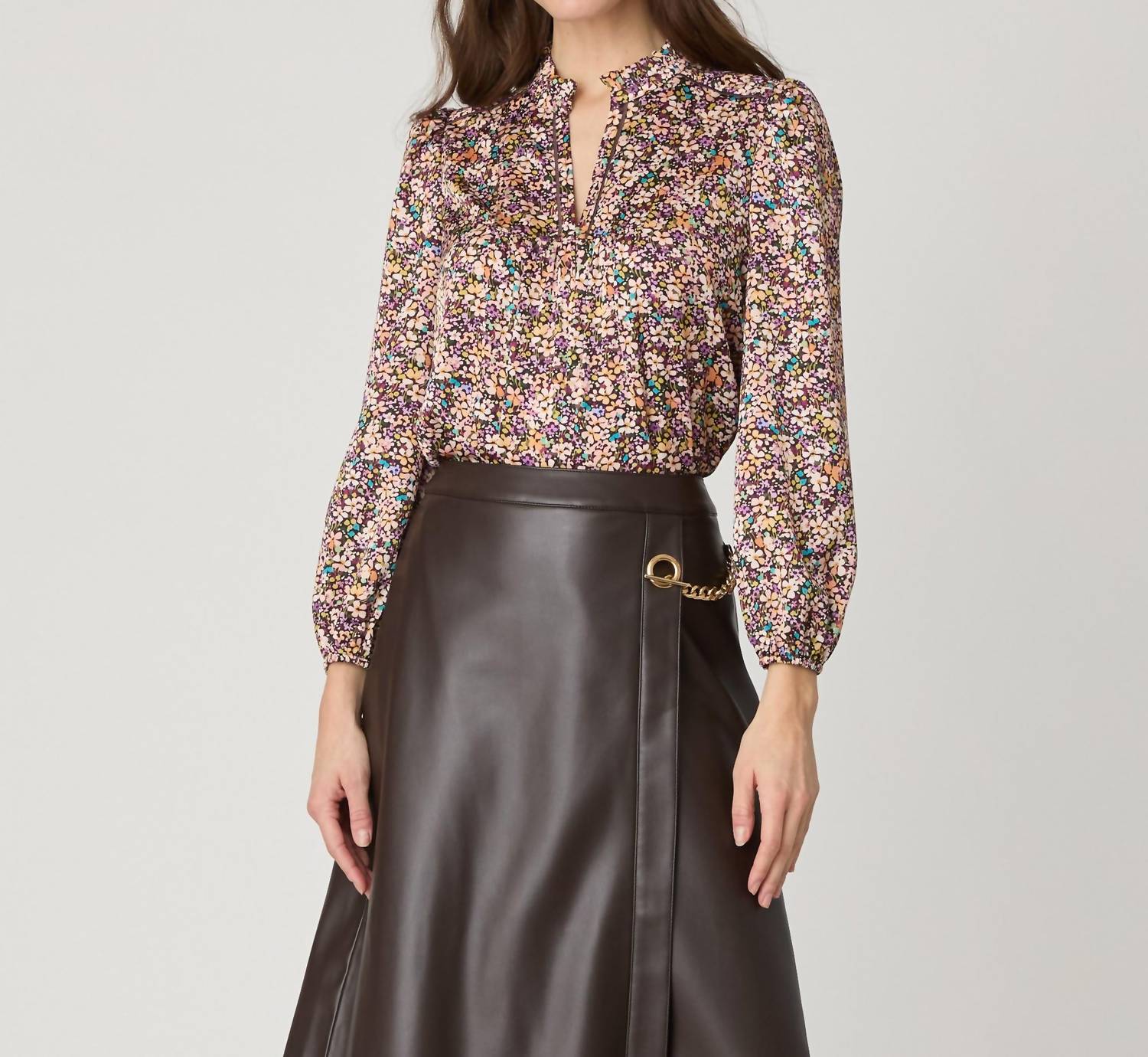 A timeless v-neck sweater that works season after season. Introducing the Desi Top by Shoshanna, a chic addition to your wardrobe in a vibrant multi-color floral print. This V-neck blouse boasts long balloon sleeves with shirring at the shoulders and encased elastic at the cuffs for a unique touch. Crafted from 100% polyester, it features contrasting solid piping along the shoulder yokes and front placket, adding stylish detail to its flowy silhouette. Closure: Pull-on design. Care: Dry clean or hand wash recommended.