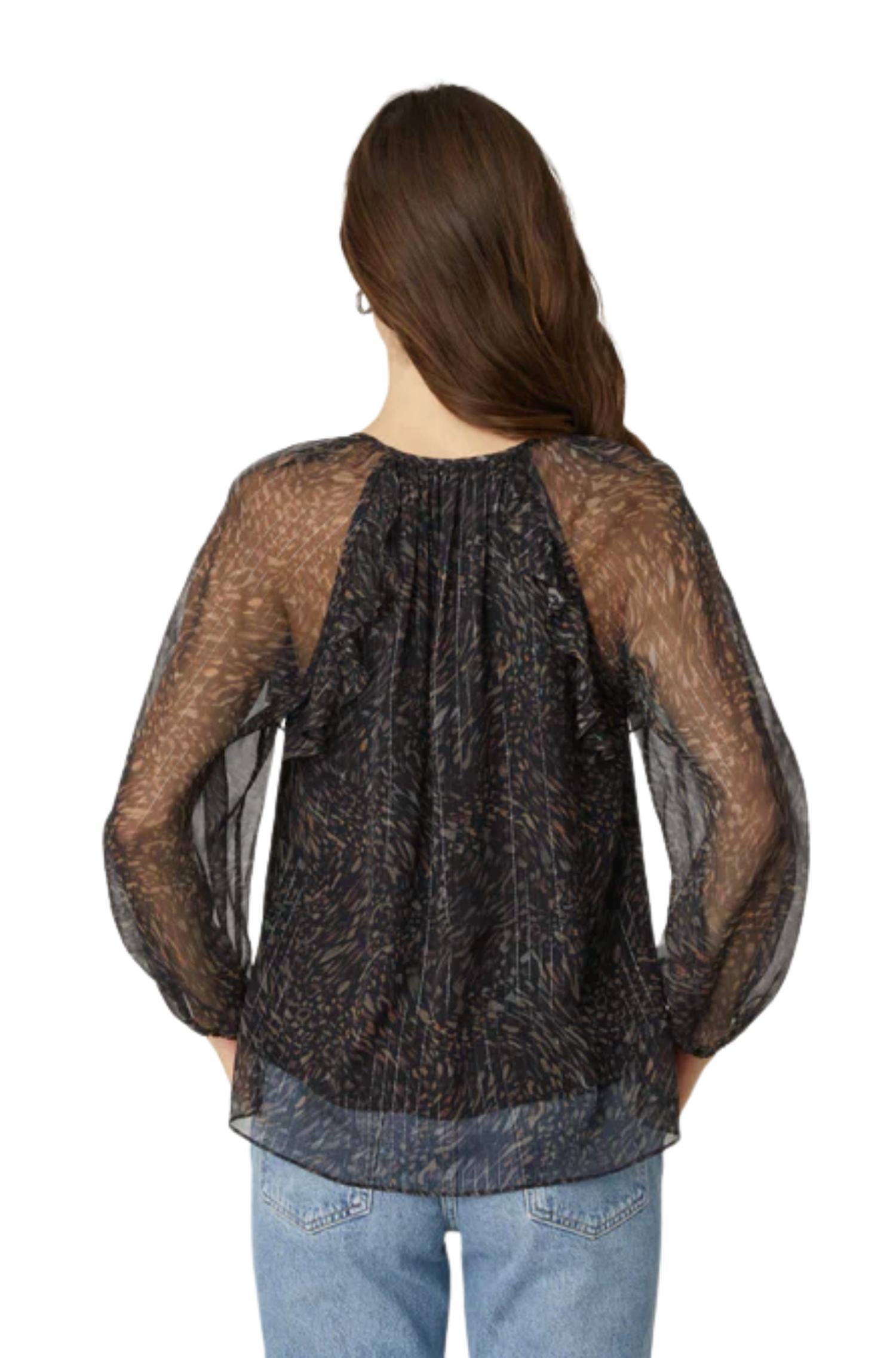 Introducing the Marlo Top by Shoshanna, a striking addition to any wardrobe in Jet Chocolate Silver. This patterned chiffon tunic blouse showcases long sleeves with sheer raglan ¾ length balloon design, featuring elastic at the openings for comfort. Designed with a pull-on closure, it offers a relaxed fit with small ruffles at the raglan seams. Perfect for Thanksgiving or a stylish dinner party, this blouse embodies effortless elegance.