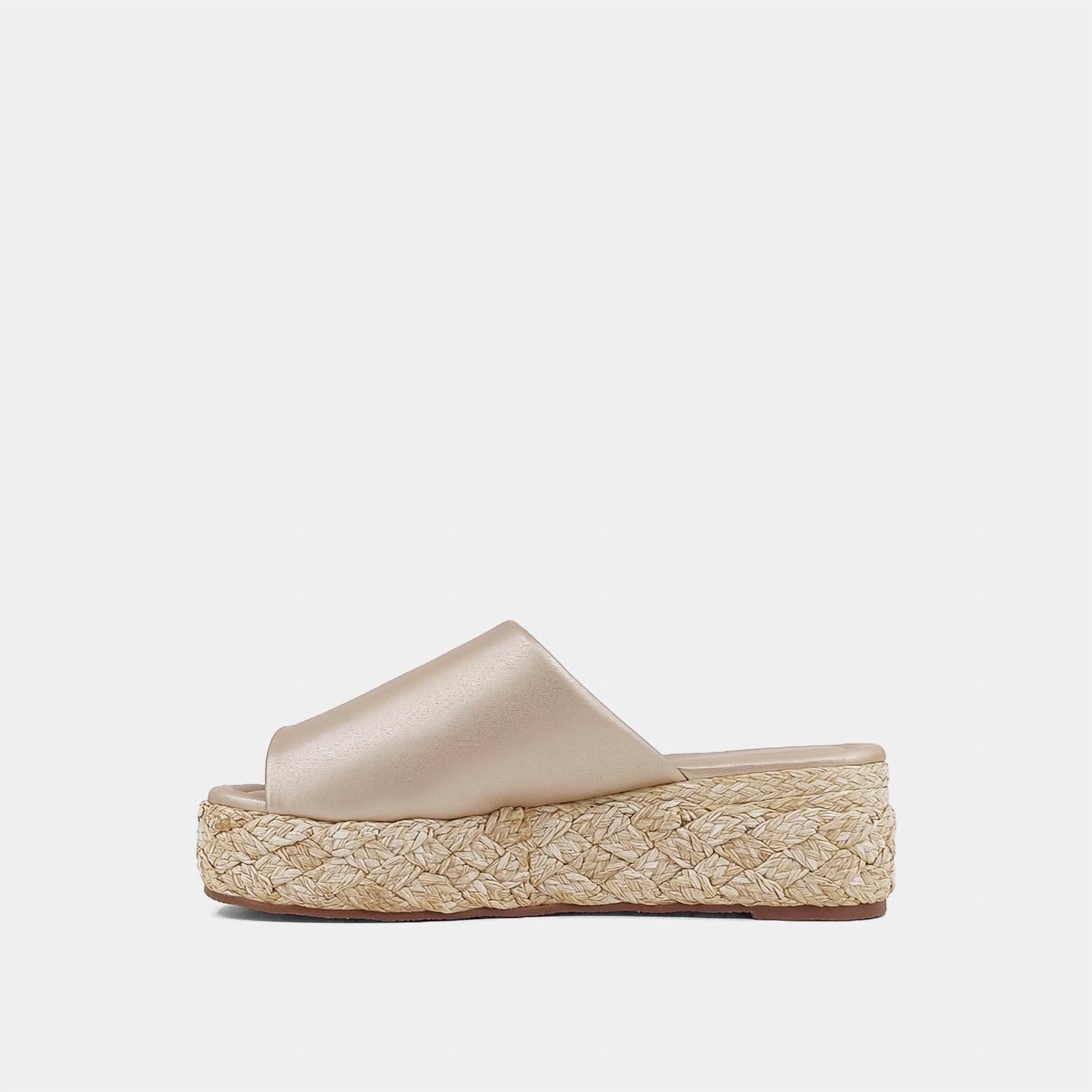 Classicly cute and all-day-wearable. We love this sandal. Step into style with the Women's Lizzie Wedge Sandal by SHU SHOP, a summer essential in a stunning gold hue. Crafted with a contemporary wedge heel made from natural jute, these sandals combine elegance and boho chic effortlessly. The open toe design coupled with intricate crossed detailing makes it perfect for vacations or any sun-filled occasion. Embrace both fashion and function with these sophisticated sandals.
