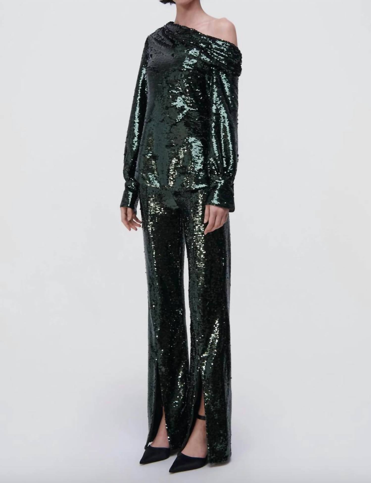 The trend report says boot-cut is in and that's exactly why we love this style. They are fit to perfection, flattering on any body type, and comfortable. They will be your go-to all season long. Elevate your wardrobe with the Ariah Sequin Pant by SIMKHAI, expertly crafted for a sophisticated look. These emerald pants showcase a relaxed fit with flared front slits, delivering a blend of modern style with an edge of drama. Made from 100% polyester fabric and lining, they feature a concealed side zipper for seamless wear. Imported and finished with a textured pattern, these pants require dry cleaning to maintain their iridescent allure.