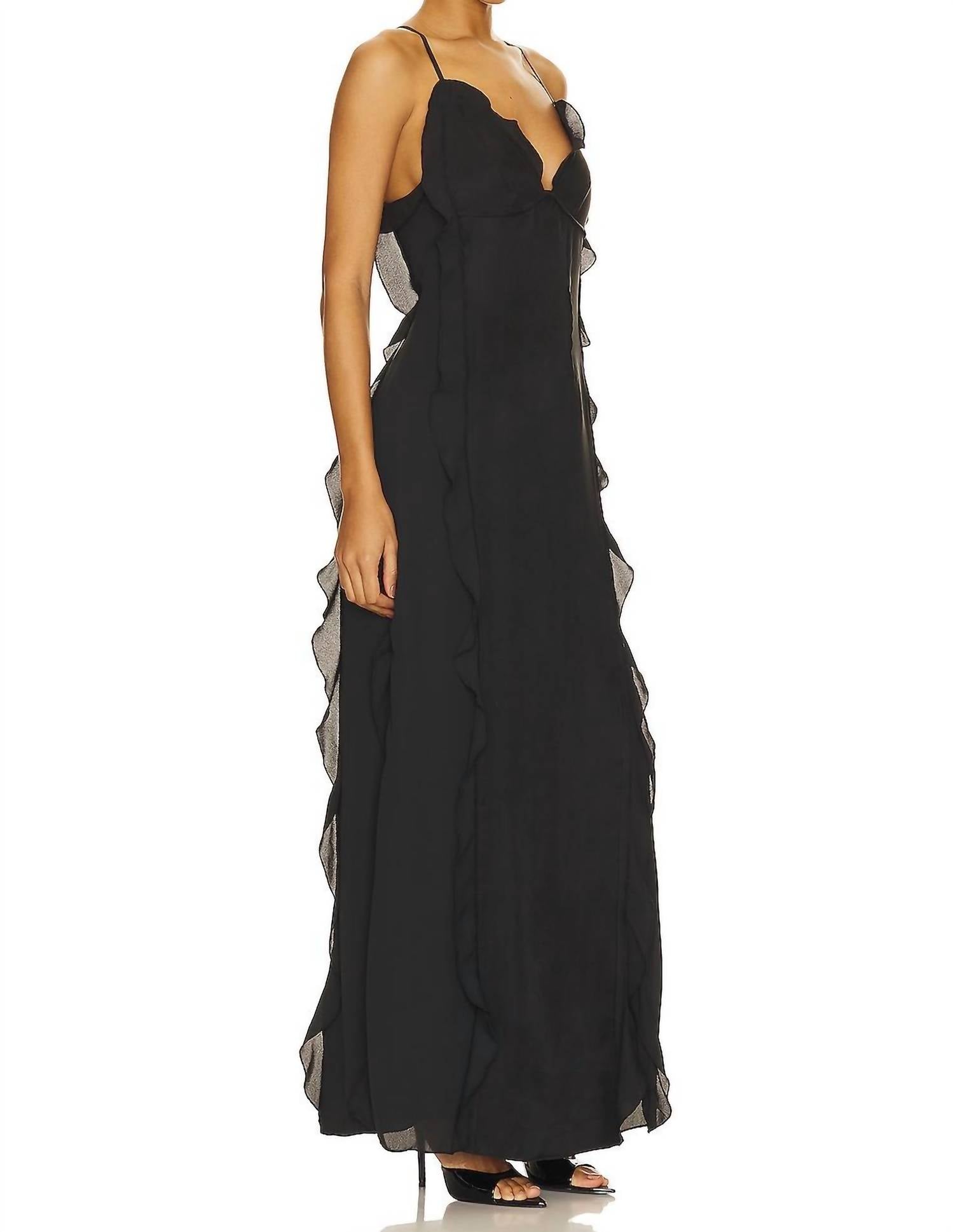Who doesn't love a good maxi dress? This one you'll be reaching for season after season. This elegant dress combines midweight sateen with chiffon contrast fabric, featuring delicate ruffle trim and a side seam slit for added movement. Fully lined for comfort, it offers easy pull-on styling. Made from a blend of cupro and viscose, with polyester contrast and lining. Dry clean only.