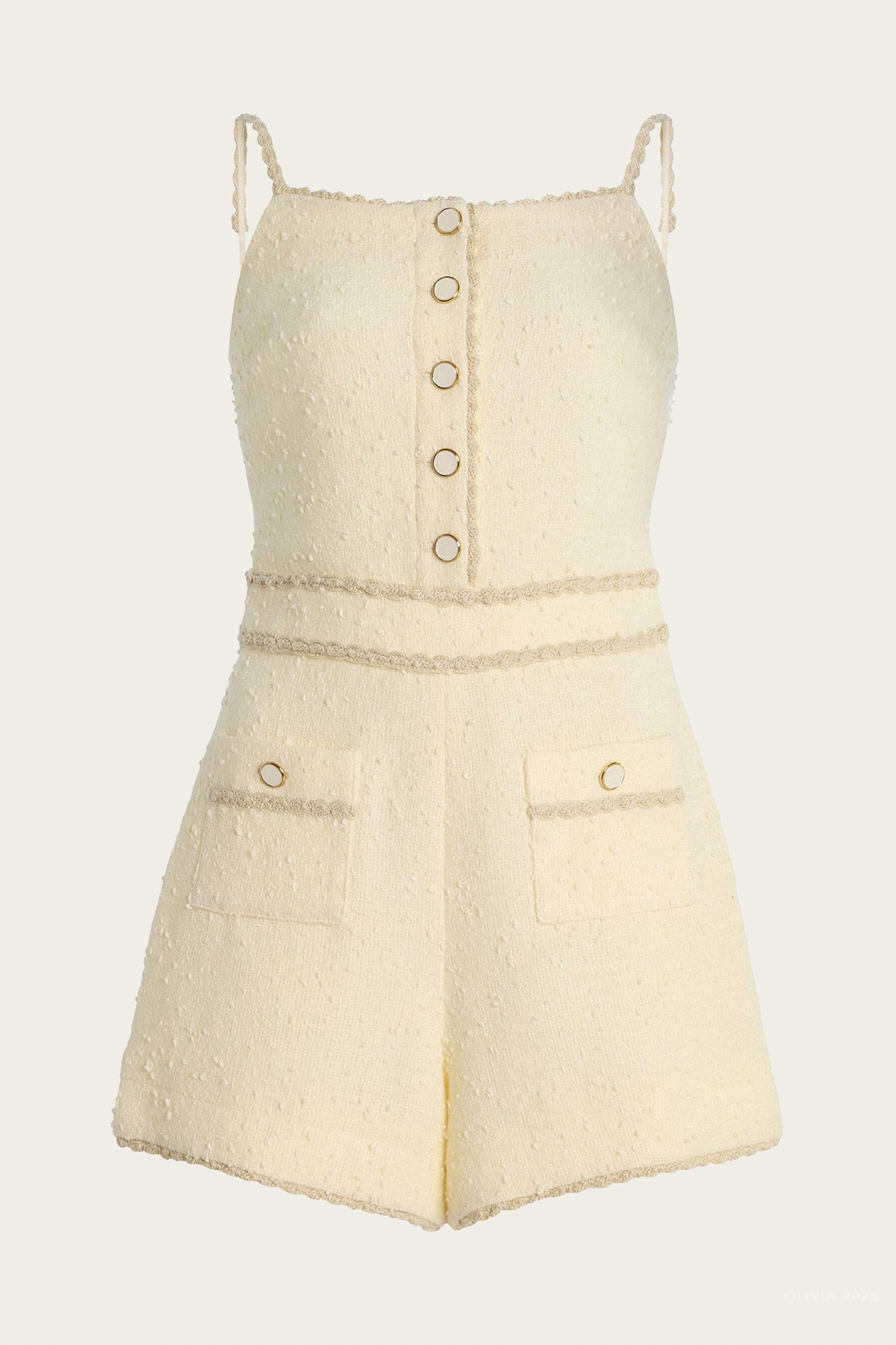It doesn't take much for this one piece to look effortlessly cool. Add some statement jewelry to dress it up, or throw on some sneakers for a more casual vibe. Meet the Ginny Romper by SIMKHAI, a sophisticated choice for any evening event in an elegant ivory hue. The textured material and relaxed fit ensure both comfort and style, featuring convenient pockets and a straight-leg cut. Crafted from a blend of 37% Polyester, 36% Acrylic, and 27% Rayon, with a 100% cotton lining for added comfort. Closure: Button closure. Care: Dry clean only. Imported with a minimalist design perfect for spring and Valentine's Day celebrations.