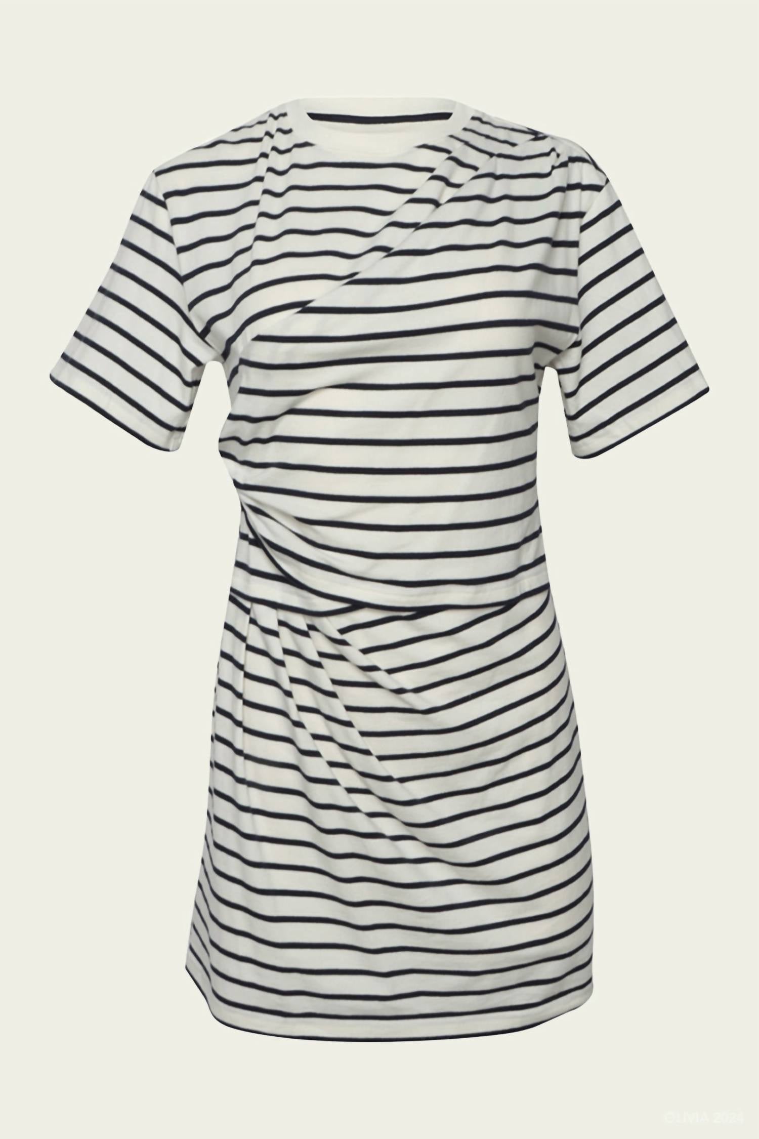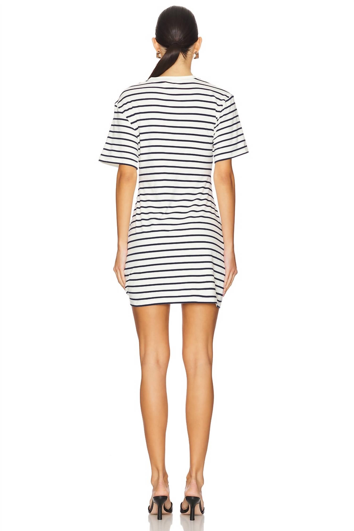 Step into effortless style with the Zeus Short Sleeve T-Shirt Dress by Simkhai, a striking piece in Midnight Stripe. This mini dress is crafted from 96% cotton with a touch of elastane for a comfortable fit, featuring short sleeves and a sleek crewneck. The lightweight jersey fabric is made in China and offers pull-on styling, enhanced by a ruched side detail for added flair. Care for this sheath silhouette by hand washing to maintain its pristine condition. 96% Cotton, 4% Cotton.