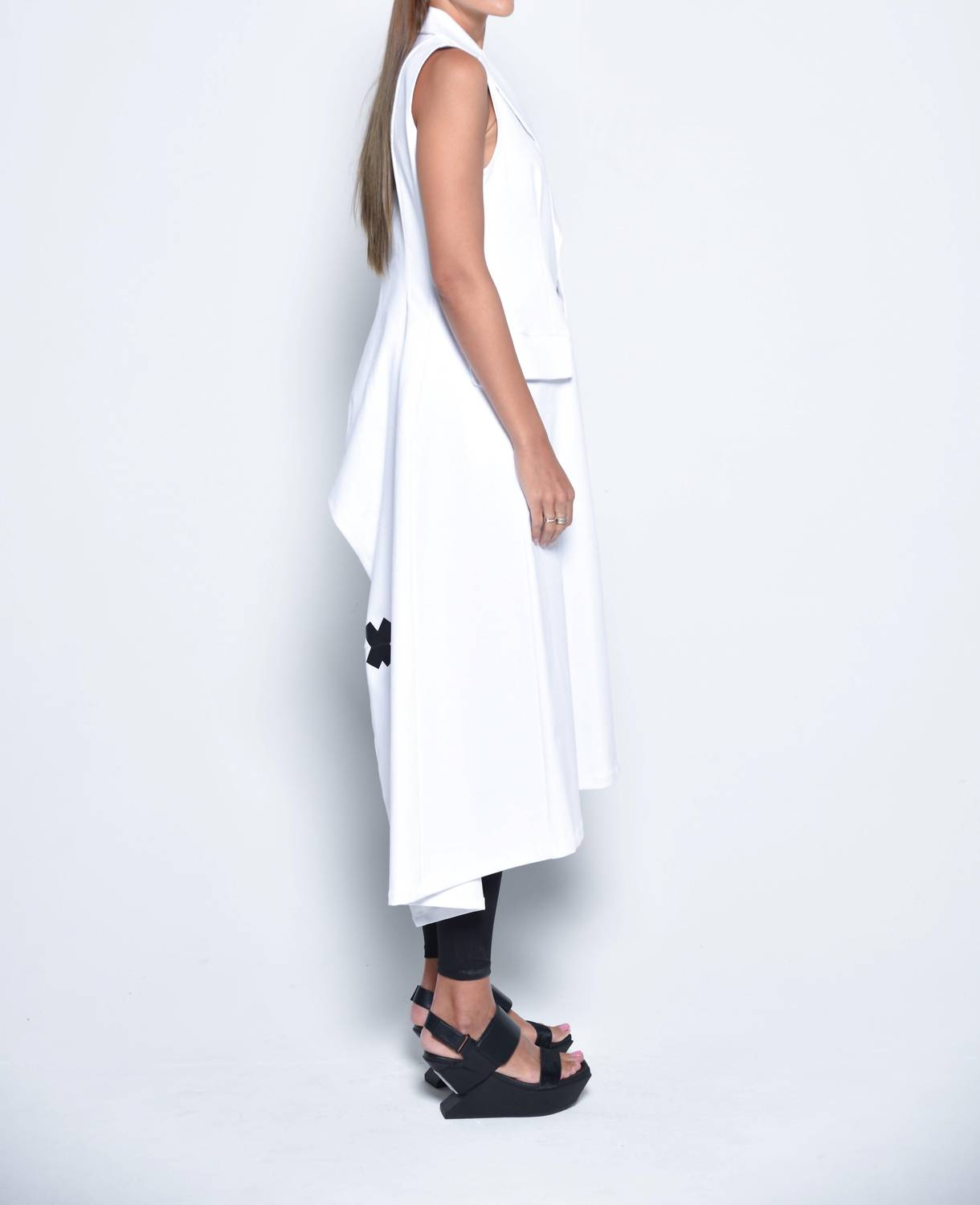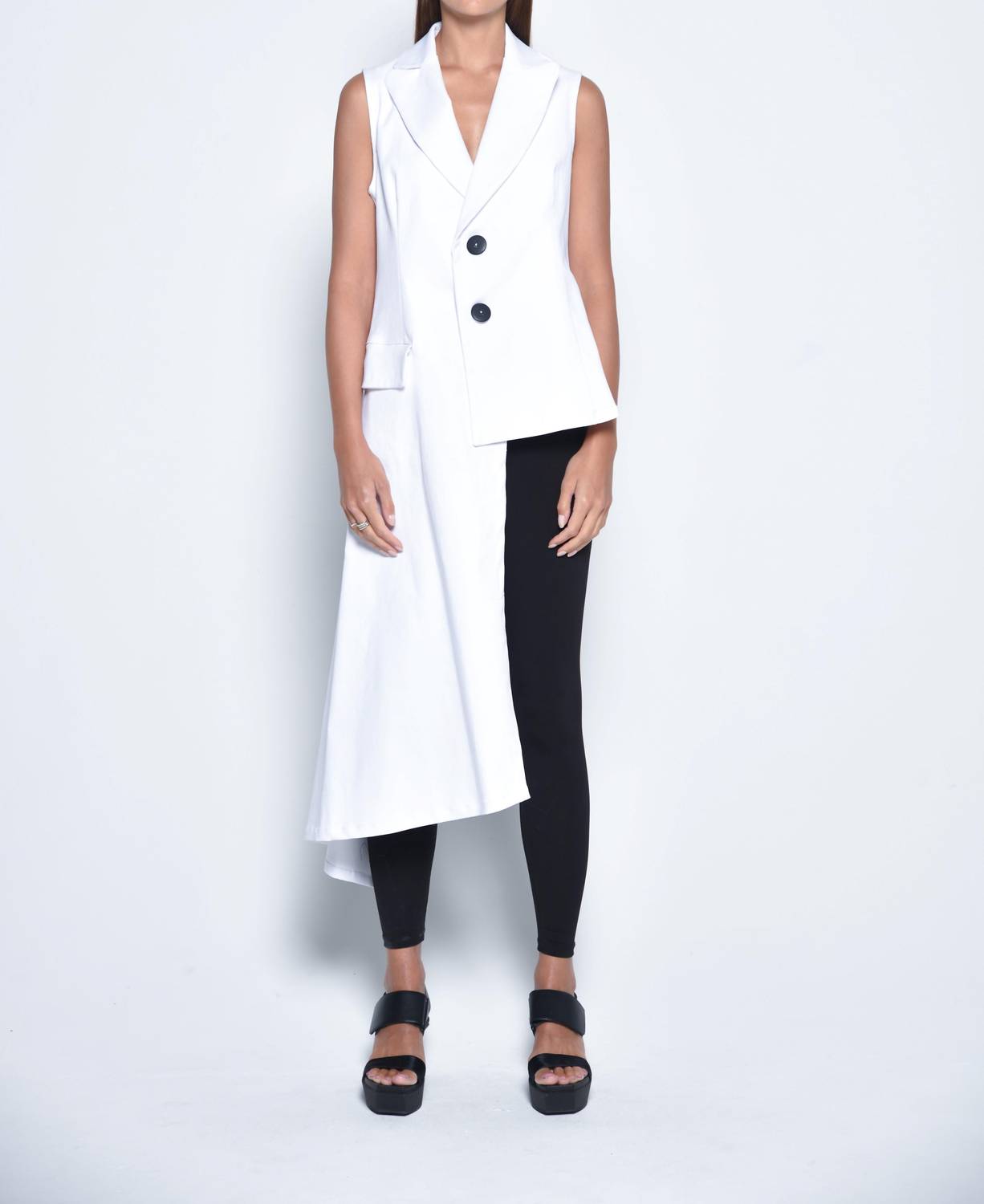 A vest so versatile you can mix and match it with almost any outfit and it will feel brand new every time. Elevate your ensemble with the Uneven Asymmetrical Vest by Simply Mila, an edgy addition to your wardrobe in white. This sleeveless vest made from 100% cotton, showcases a striking asymmetrical design with right side measuring 46" and left side 24". Made in the USA, it features a convenient pocket and button closure. Care is a breeze with machine wash on a delicate cycle, air dry, and cool ironing if needed. Available in sizes XS and S, the bust measures 34" and 36" respectively.