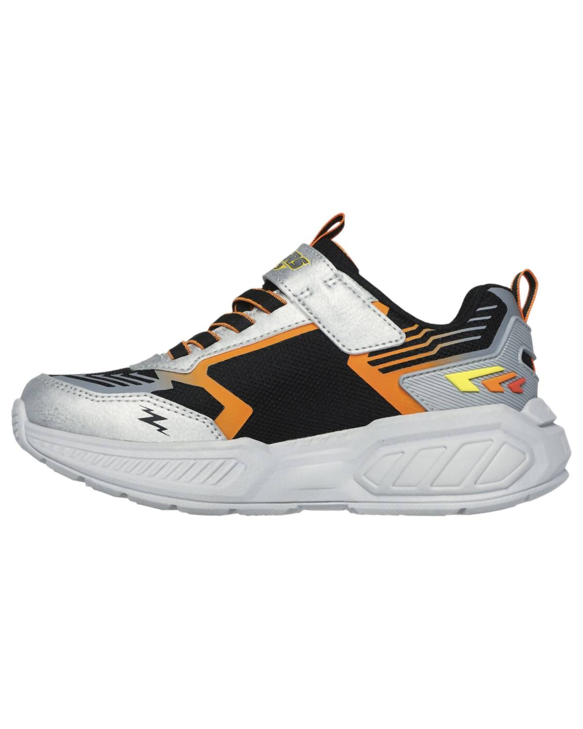 Discover the S-Lights Light Storm Sneakers by Skechers, crafted for little kids seeking vibrant style and comfort. These silver and black sneakers flaunt a mesh and synthetic upper along with a multicolored light-up tech piece midsole. Designed with a flat rubber sole, they feature stretch laces and an adjustable instep strap for a secure fit. The round toe and medium width ensure a comfortable wear for everyday adventures.