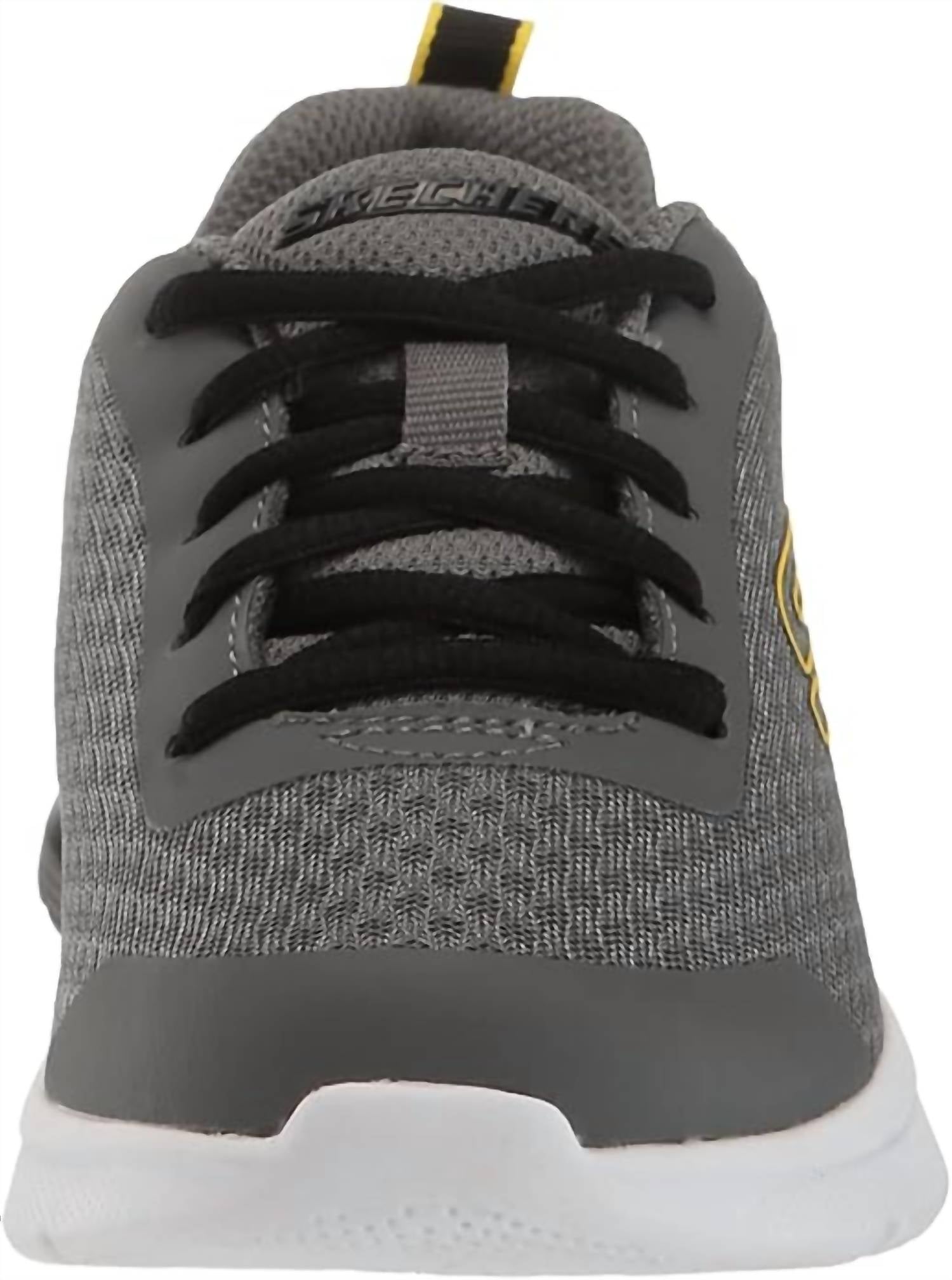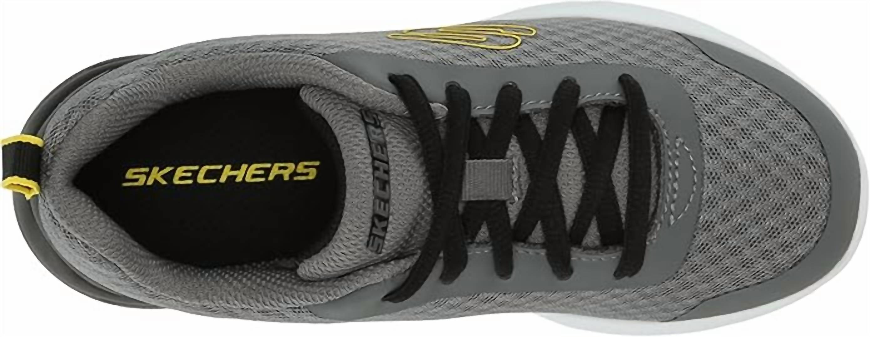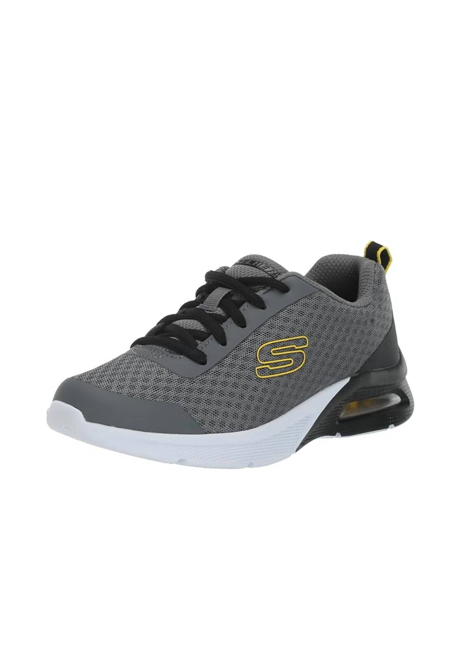 Step up his style with the Skechers Kids Boy's Microspec Max Sneaker in sleek gray, perfect for a sporty streetwear look. These sneakers feature a lightweight lace-up design with a mesh and synthetic upper, complemented by a round toe and cushioned comfort insole. The Skech-Air visible airbag midsole enhances comfort with every step, and the polyurethane sole ensures durability. Closure: Lace-up. Care: Machine wash. Ideal for the back-to-school season, this medium-width shoe is crafted with attention to detail and designed specifically for teens.
