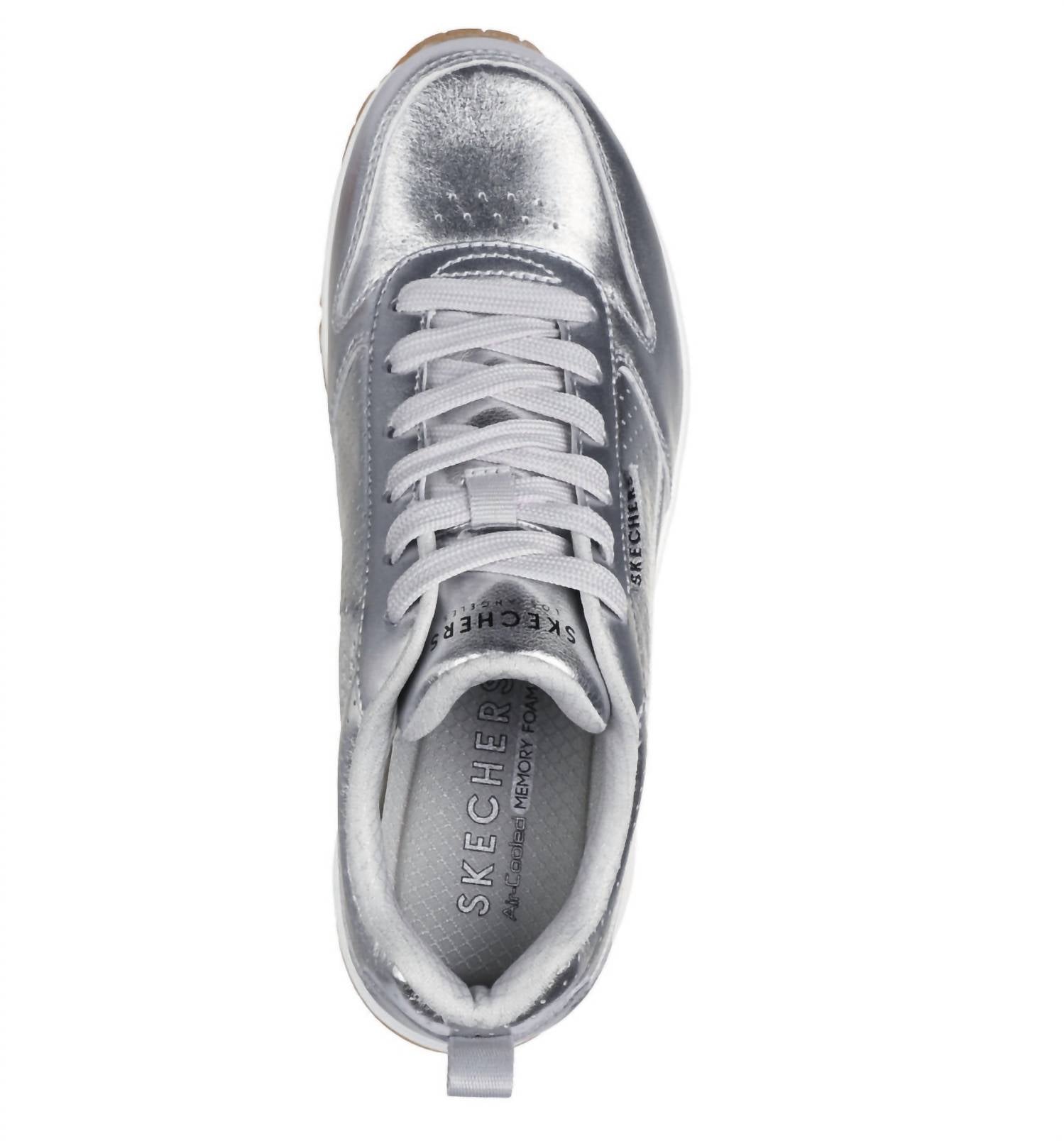 Cute, functional, and comfortable. These sneakers check all the boxes. Elevate your footwear collection with the Women's Uno Metallixs Sneakers by Skechers, crafted to turn heads with their sleek metallic silver finish. Designed for adult women, these sneakers feature a comfortable round toe shape and a low heel height of 1.5 inches. Offering a perfect blend of style and comfort, they are an ideal choice for versatile fashion statements. Make a bold impression this fall with these unique sneakers, showcasing Skechers' signature flair.