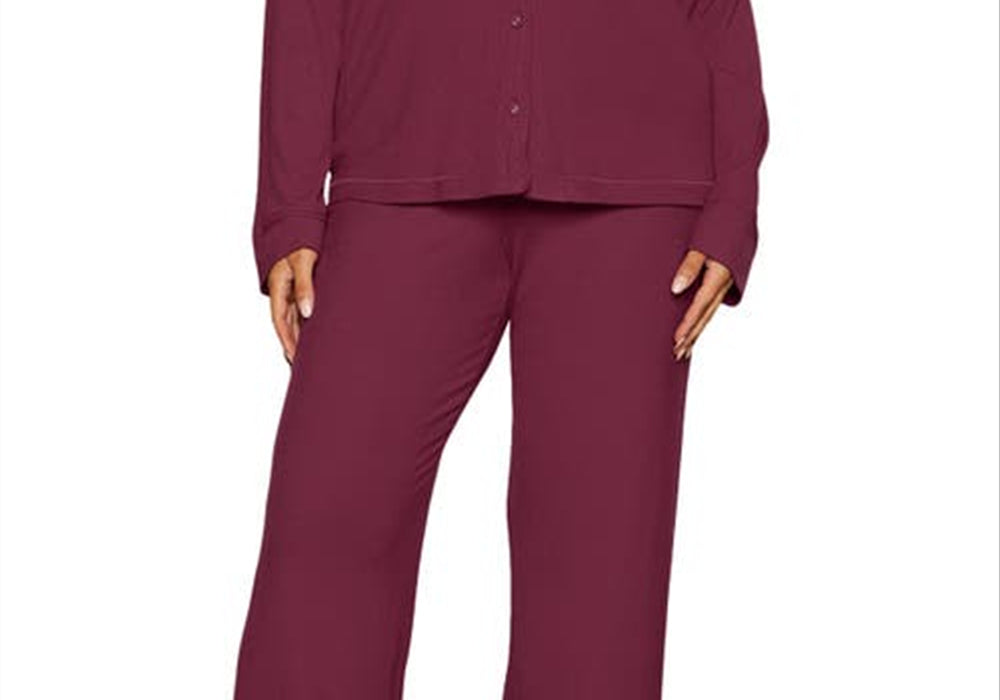 Cozy, ribbed pajamas in a deep wine hue | - Perfect for lounging or relaxing at home | - Soft and comfortable fit for ultimate comfort.