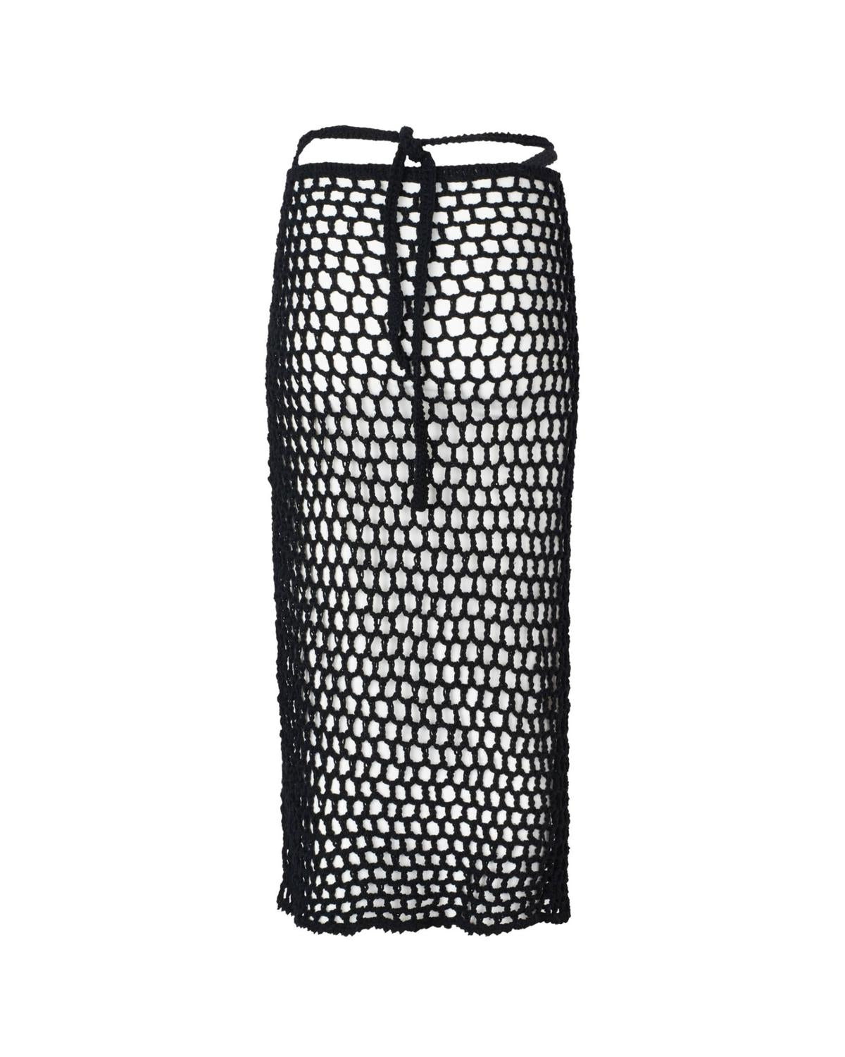 Introducing the Women's Alessia Long Crochet Skirt by SOAH, a perfect blend of relaxed elegance for summer beach days. This black midi skirt features a textured crochet pattern, offering a sophisticated fit and is equipped with a convenient tie closure. Designed without pockets for a sleek silhouette, this effortless piece is a must-have for your seasonal wardrobe. Please note that care instructions are not provided.