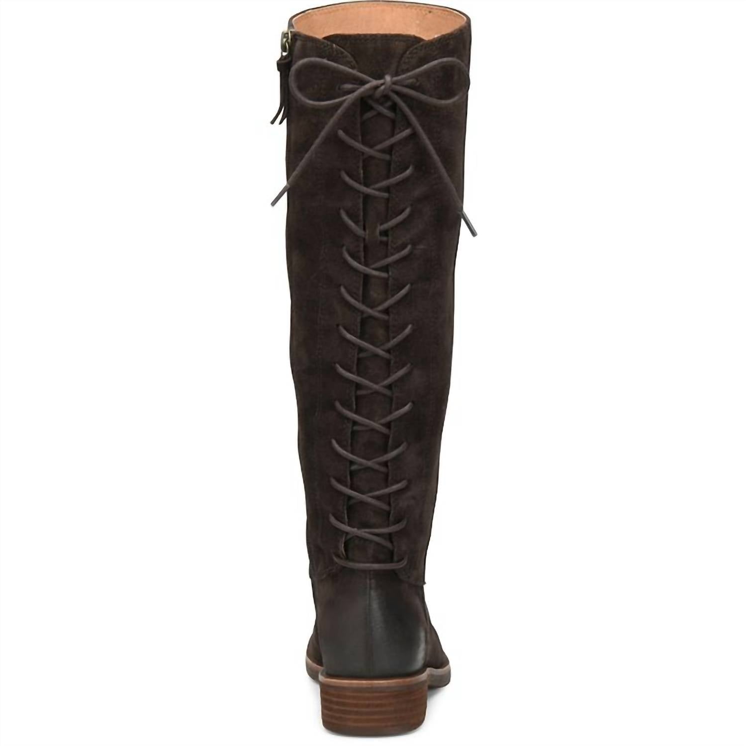 A stylish boot with a comfortable fit and the perfect amount of height. These classic boots are the perfect addition to any outfit and can be worn season after season. Introducing the Women's Sharnell II Boot by Sofft, a chic and weather-ready choice in Dark Brown. The boots feature a 1.5-inch block heel and a round toe silhouette, with a 14-inch shaft height, adjustable lacing, and an inside zipper with a leather pull for convenience. Crafted from stain-resistant, waterproof Italian leather or suede, and designed with seam-sealed construction for moisture protection. Care: For consistent quality and appearance, maintain with suitable leather care products.