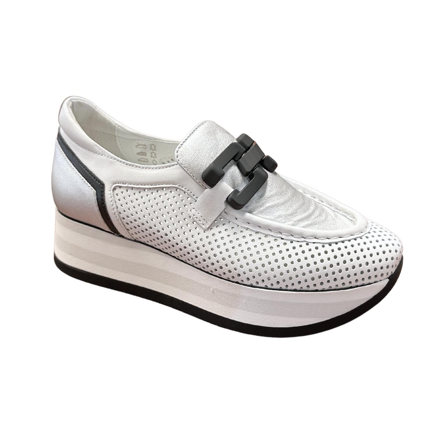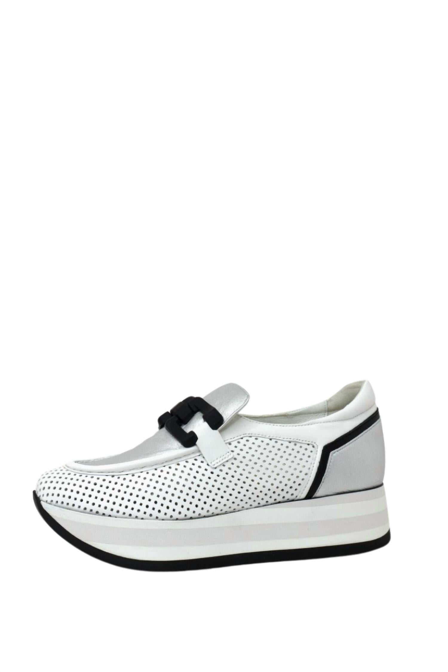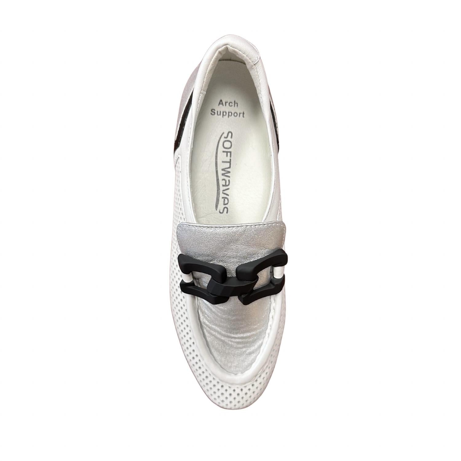 Step into style with the Women's Chrys Loafer Sneakers by Softwaves, crafted from luxurious leather in a chic white/silver color. These loafers feature a sophisticated low platform heel of 1.77 inches and a round toe design, perfect for making a subtle fashion statement. Experience comfort with double gored elastic and a removable padded insole for a custom fit. Elevate your casual ensemble effortlessly with these sleek flats.