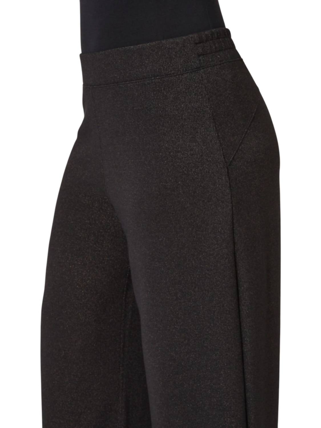 Wide leg style with a 20" approximate leg opening. Relaxed fit with contoured back for a flattering rear view. Mid-rise waist for a comfortable, flattering fit. Full-length design for versatile styling. Comfortable fabric ideal for all-day wear. 47% Polyester, 38% Modal, 11% Metallic, 4% Elastane.