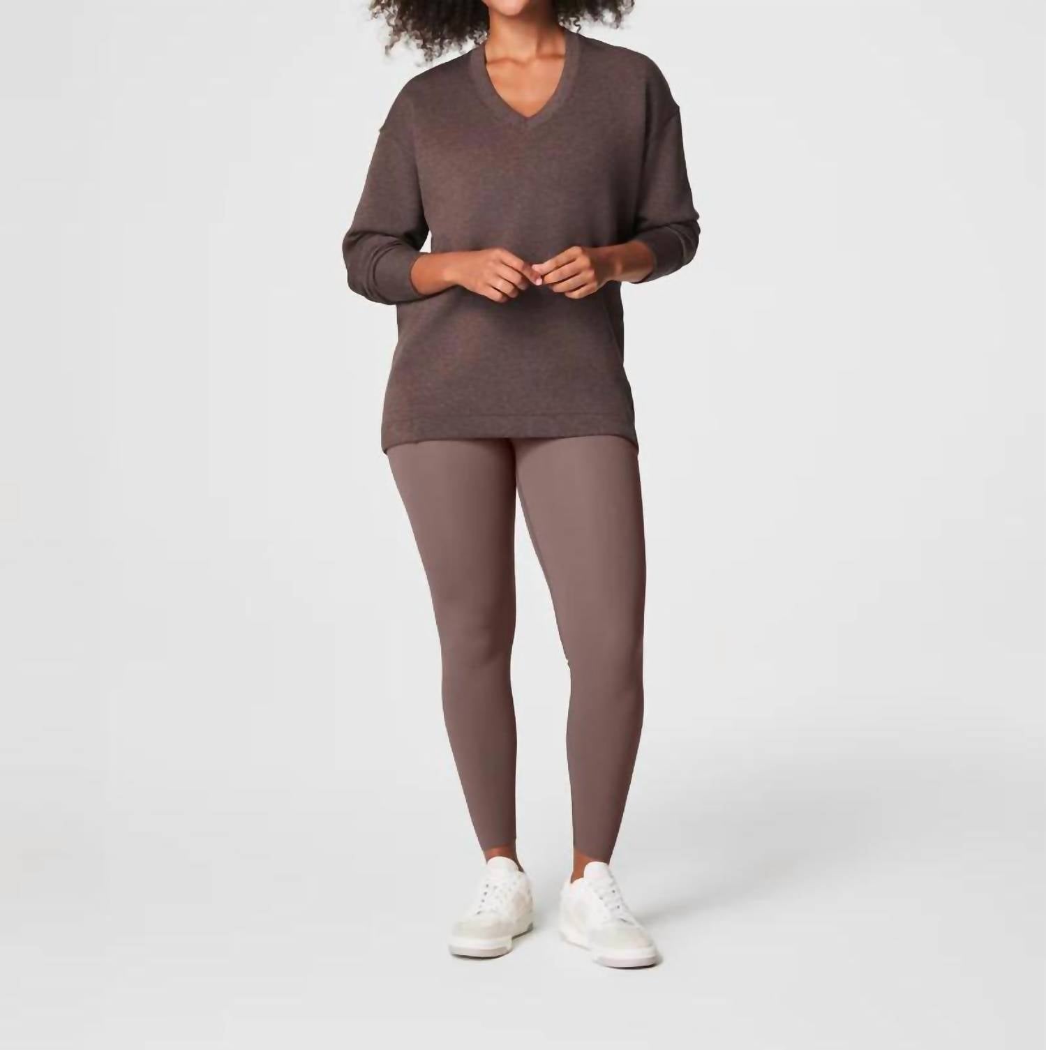 Embrace the versatility of this tunic-style blouse, expertly crafted for seamless layering or perfect to wear on its own. Its detailed design and comfortable fit make it a perfect addition to any closet. Experience unmatched comfort in Heather Smoke. Solid V-neck tunic features long sleeves. Crafted from a high-quality blend of 54% Polyester, 40% Modal, and 6% Elastane. Offering breathable 4-way stretch and a peachy-soft interior. Garment measures 28 inches in length. Designed with a pull-on closure for effortless wear. Machine washable on a gentle cycle.