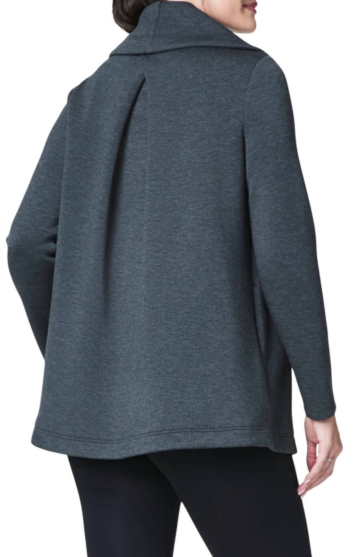 Throw this adorable cardigan over any cami or tank top. Elevate your wardrobe with the Spanx Airessentials Drapefront Cardi in Dark Grey Heather. This long-sleeve cardigan, composed of 47% modal, 46% polyester, and 7% elastane, falls stylishly past the hips with an open front and shawl collar. Crafted from a smooth spacer fabric, it features an inverted box pleat at the back for a flattering and layer-ready fit, complete with UPF 50+ sun protection. Care is a breeze with options for dry cleaning or machine washing, and it is conveniently imported for your fashion needs.