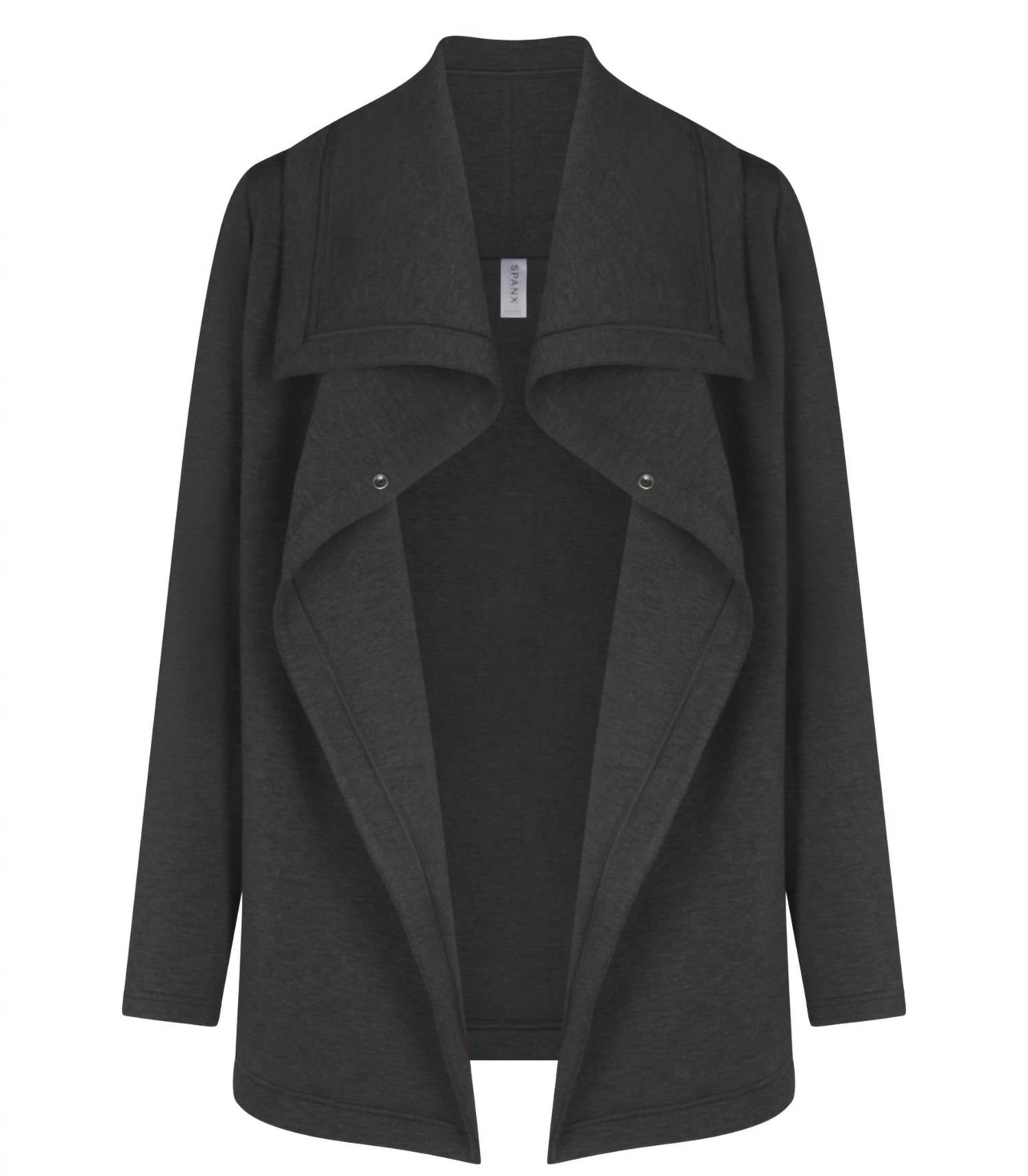 Elevate your wardrobe with the Spanx Airessentials Drapefront Cardi in Dark Grey Heather. This long-sleeve cardigan, composed of 47% modal, 46% polyester, and 7% elastane, falls stylishly past the hips with an open front and shawl collar. Crafted from a smooth spacer fabric, it features an inverted box pleat at the back for a flattering and layer-ready fit, complete with UPF 50+ sun protection. Care is a breeze with options for dry cleaning or machine washing, and it is conveniently imported for your fashion needs.