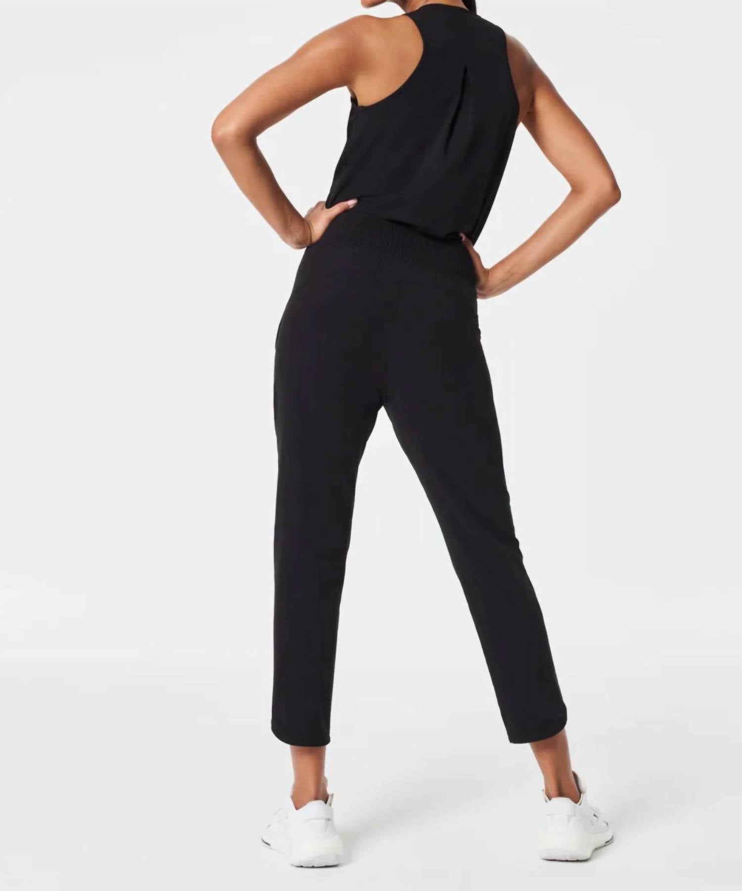 Experience ultimate comfort and style with the Spanx On The Move Tapered Pant in Very Black. Designed for women, these pants feature a solid pattern with a comfort fit and mid-rise waistband. The straight leg style and functional front pockets with hidden snaps enhance your ease and security. Made from 88% Polyester and 12% Elastane, the pull-on pants are imported and easy to care for—simply machine wash on a gentle cycle and tumble dry low.