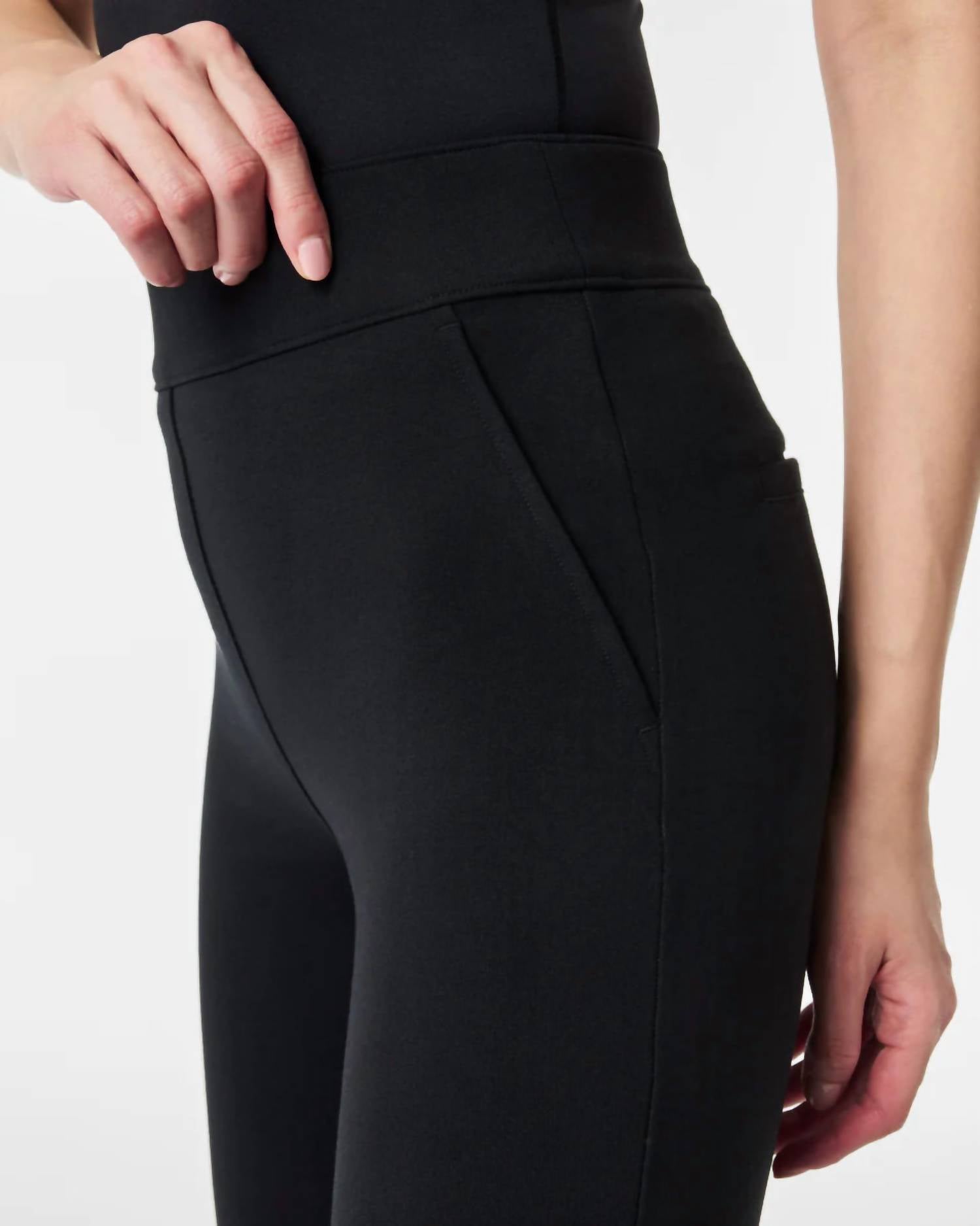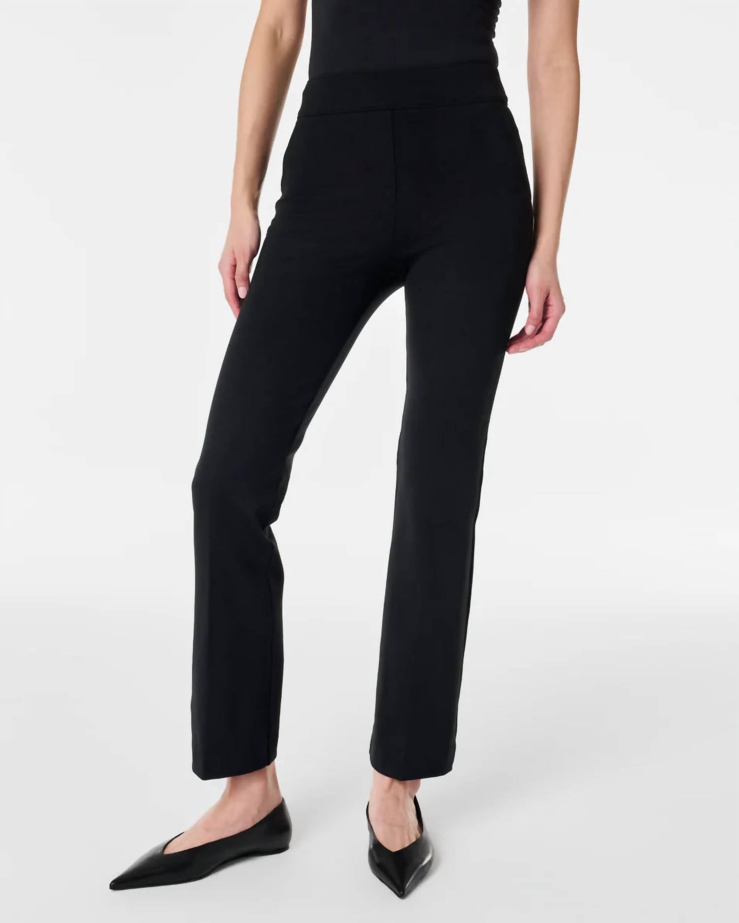 A straightleg pant that workes season after season. Dress these up with your favorite blouse or keep it casual with your go-to tee. Meet the Perfect Kick Flare Pant by Spanx, designed in Classic Black for a sleek professional look. Crafted from smoothing premium ponte fabric, these pants feature a high-rise waist and a cropped, slightly flared leg with a 26.5" inseam. With hidden core shaping technology and booty lifting, the pull-on design ensures comfort and style without the need for buttons or zippers. The composition of 68% Rayon, 28% Nylon, 4% Elastane ensures a smooth fit, while care is made easy with machine washing on a gentle cycle and line drying.