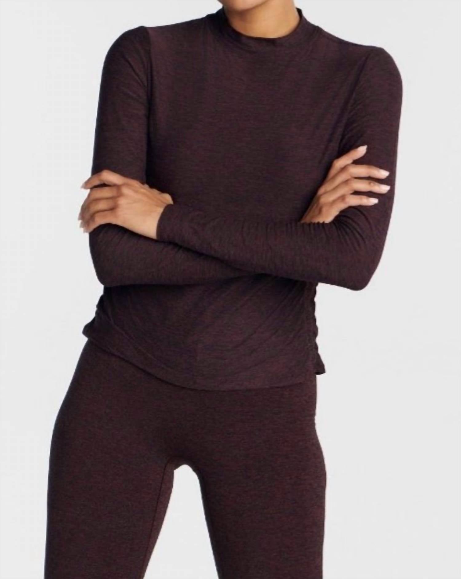 Great fit, cute design, soft fabric. You'll love everything about this long sleeve tee. Indulge in the luxurious comfort of the Spanx Skysoft Mock Neck in Truffle Heather, featuring long sleeves for a sleek and sophisticated look. This women's top boasts a solid pattern and a flattering mockneck, perfect for versatile styling. Crafted without a specific garment length, it offers a pull-on closure for effortless wear. Elevate your collection with this essential piece, designed for style and ease.